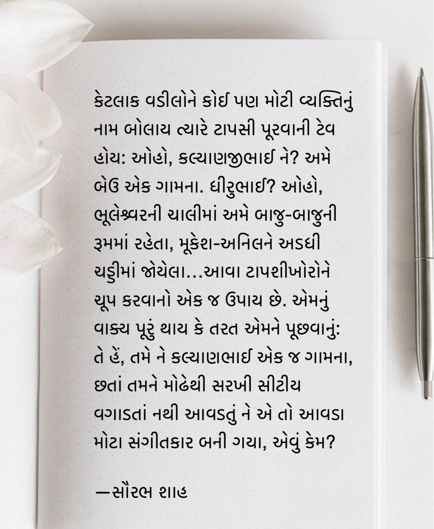 કેટલાક વડીલોને કોઈ પણ મોટી વ્યક્તિનું નામ બોલાય ત્યારે ટાપસી પૂરવાની ટેવ હોય: ઓહો, કલ્યાણજીભાઈ ને? અમે બેઉ એક ગામના. ધીરુભાઈ? ઓહો, ભૂલેશ્ર્વરની ચાલીમાં અમે બાજુ-બાજુની રૂમમાં રહેતા, મૂકેશ-અનિલને અડધી ચડ્ડીમાં જોયેલા. અને અરવિંદ જોષી? શર્મન આવડો હતો ત્યારે જોયેલો એને. એ તો મારા ફાધરની ઑફિસમાં નોકરી કરતા. આવા ટાપશીખોરોને ચૂપ કરવાનો એક જ ઉપાય છે. એમનું વાક્ય પૂરું થાય કે તરત એમને પૂછવાનું: તે હેં, તમે ને કલ્યાણભાઈ એક જ ગામના, છતાં તમને મોઢેથી સરખી સીટીય વગાડતાં નથી આવડતું ને એ તો આવડા મોટા સંગીતકાર બની ગયા, એવું કેમ? ધીરુભાઈના તમે પાડોશી હતા ને અત્યારે એમના પેલા અડધી ચડ્ડીવાળા દીકરાઓ એન્ટિલા અને સી-વિન્ડમાં રહે છે જ્યારે તમે કેમ ભૂલેશ્ર્વરથી ભાયંદરમાં વન બીએચકેમાં રહેવા આવી ગયા? અરવિંદ જોષીનું નામ તો કાન્તિ મડિયા અને શૈલેષ દવેની હરોળનું ગણાતું પણ તમે કેમ હજુય ઉઘડતા પડદે ડ્રોઈંગ રૂમના સોફા પર ફટકો મારવાનાં પાત્રો કર્યા કરો છો?