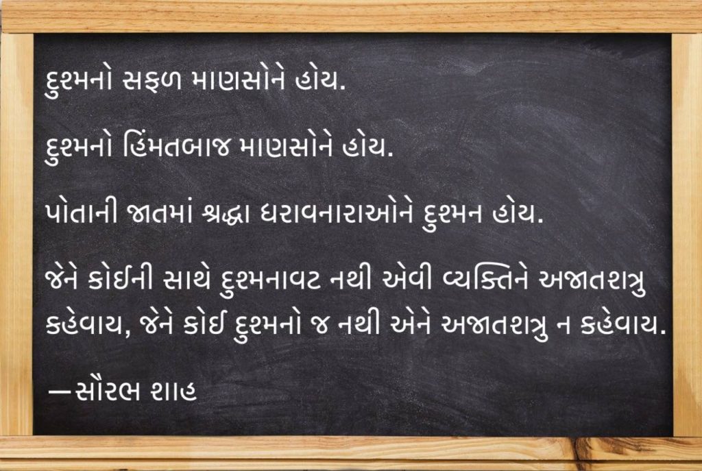 દુશ્મનો બનાવવા માટે જાત સાથેની સચ્ચાઈ સાચવતાં શીખવું પડે. દુશ્મનો બનાવવા માટે બધાને બધી વખત ખુશ રાખ્યા કરવાના પ્રયત્નોની વ્યર્થતાને સમજી લેવી પડે. દુશ્મનો બનાવવા માટે તમારી પોતાની દુનિયામાં તમારું કેટલું મહત્ત્વ છે તે જાણી લેવું પડે.