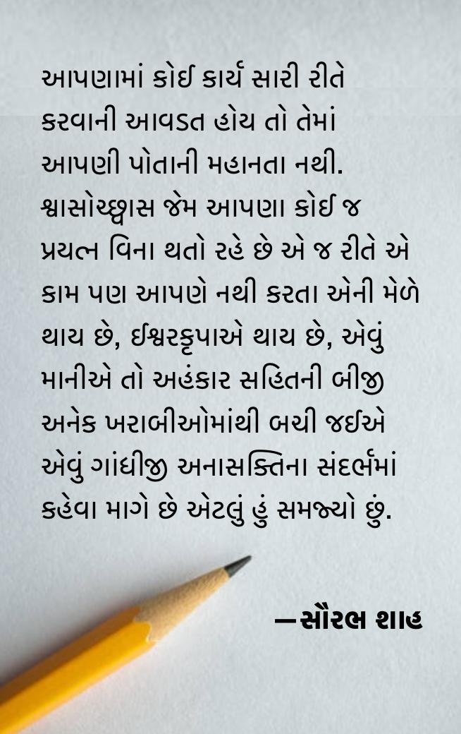 આપણામાં કોઈ કાર્ય સારી રીતે કરવાની આવડત હોય તો તેમાં આપણી પોતાની મહાનતા નથી. શ્વાસોચ્છ્વાસ જેમ આપણા કોઈ જ પ્રયત્ન વિના થતો રહે છે એ જ રીતે એ કામ પણ આપણે નથી કરતા એની મેળે થાય છે, ઈશ્વરકૃપાએ થાય છે, એવું માનીએ તો અહંકાર સહિતની બીજી અનેક ખરાબીઓમાંથી બચી જઈએ એવું ગાંધીજી અનાસક્તિના સંદર્ભમાં કહેવા માગે છે એટલું હું સમજ્યો છું.