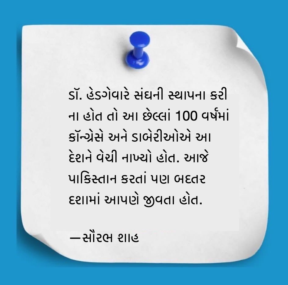ડૉ. હેડગેવારે સંઘની સ્થાપના કરી ના હોત તો આ છેલ્લાં 100 વર્ષમાં કૉન્ગ્રેસે અને ડાબેરીઓએ આ દેશને વેચી નાખ્યો હોત. આજે પાકિસ્તાન કરતાં પણ બદતર દશામાં આપણે જીવતા હોત. ડૉ. હેડગેવારે પોતાના અનુગામી ગુરુ ગોલવલકર જેવા અનેક સામાજિક અને સાંસ્કૃતિક સેનાનીઓ તૈયાર કર્યા. સંઘના સંસ્કારને કારણે શ્યામાપ્રસાદ મુખર્જી, દીનદયાલ ઉપાધ્યાય, અટલ બિહારી વાજપેયી, લાલકૃષ્ણ આડવાણીથી લઈને નરેન્દ્ર મોદી અને અમિત શાહ જેવા સેંકડો-હજારો નેતા ભારતને મળ્યા અને એમના નેતૃત્વમાં સંઘના લાખો-કરોડો કાર્યકર્તાઓએ આ દેશના ઉજ્જવળ ભવિષ્ય માટે આજીવન કાર્ય કરીને જાત ઘસી નાખી.