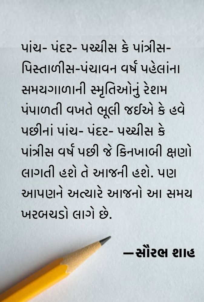 પાંચ- પંદર- પચ્ચીસ કે પાંત્રીસ-પિસ્તાળીસ-પંચાવન વર્ષ પહેલાંના સમયગાળાની સ્મૃતિઓનું રેશમ પંપાળતી વખતે ભૂલી જઈએ કે હવે પછીનાં પાંચ- પંદર- પચ્ચીસ કે પાંત્રીસ વર્ષ પછી જે કિનખાબી ક્ષણો લાગતી હશે તે આજની હશે. પણ આપણને અત્યારે આજનો આ સમય ખરબચડો લાગે છે.