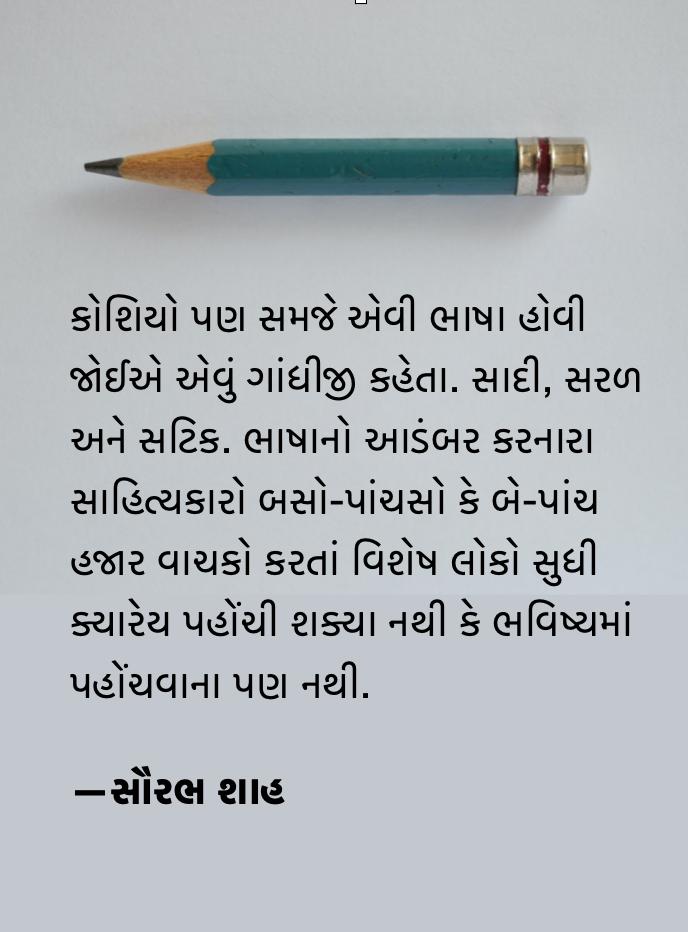 કોશિયો પણ સમજે એવી ભાષા હોવી જોઈએ એવું ગાંધીજી કહેતા. સાદી, સરળ અને સટિક. ભાષાનો આડંબર કરનારા સાહિત્યકારો બસો-પાંચસો કે બે-પાંચ હજાર વાચકો કરતાં વિશેષ લોકો સુધી ક્યારેય પહોંચી શક્યા નથી કે ભવિષ્યમાં પહોંચવાના પણ નથી. કહેવા ખાતર આમાંના કેટલાક લેખકો લાખો નકલોનો ફેલાવો ધરાવતા છાપાઓમાં છપાય છે પણ એમને વાંચનારા કેટલા? આંગળીને વેઢે ગણાય એટલા. અને એમનું ચમચામંડળ એમને માથે મૂકીને નાચે. ભલે. આપણે શું.