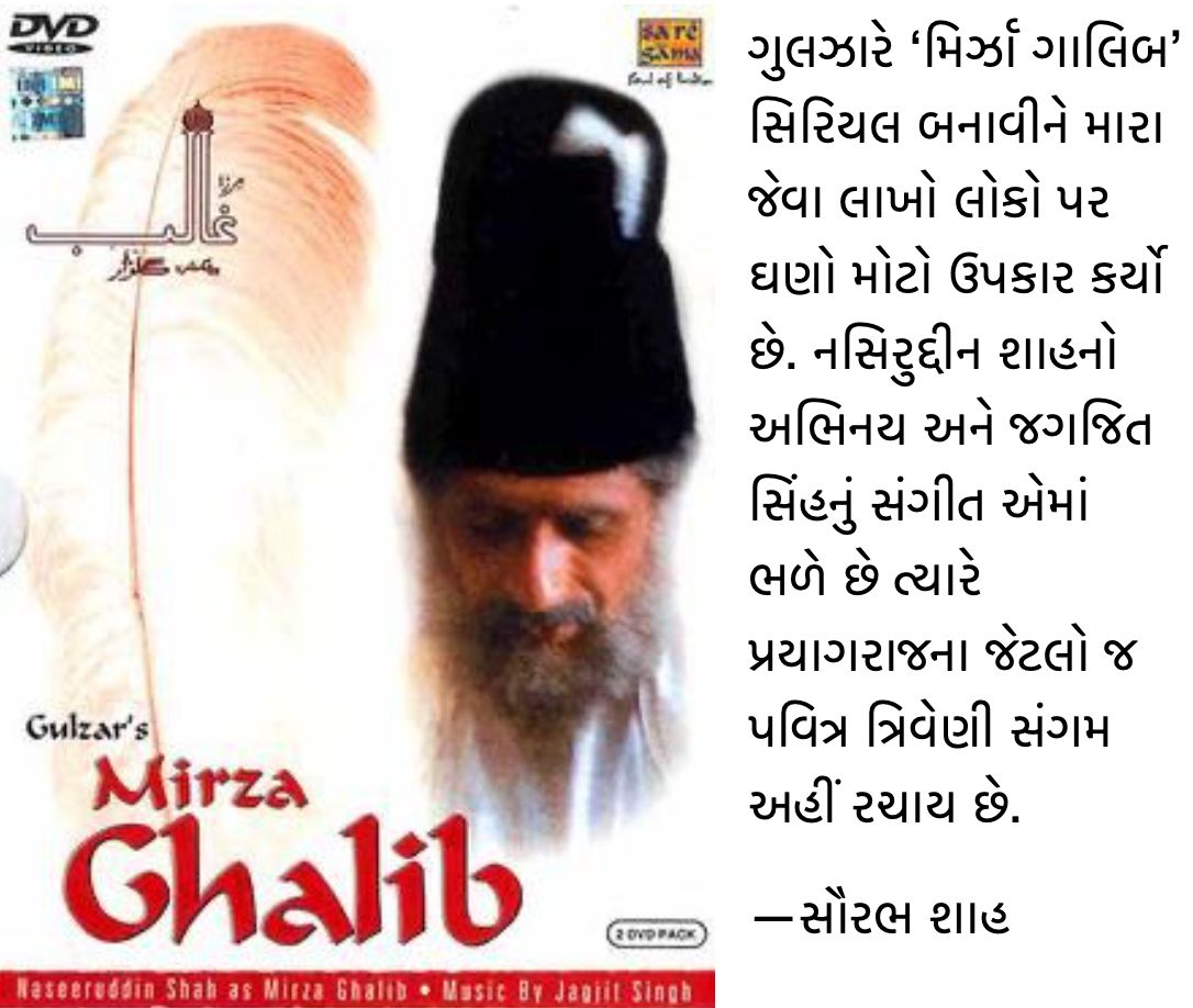 કવિતાની બાબતમાં આપણે અંગૂઠાછાપ પણ ગાલિબની ગઝલો સાંભળીને લાગે કે જીવનના અનુભવોના નીચોડની પદ્યમાં રજૂઆત કરવાની હોય તો આ રીતે જ કરાય. ગુલઝારે ‘મિર્ઝા ગાલિબ’ સિરિયલ બનાવીને મારા જેવા લાખો લોકો પર ઘણો મોટો ઉપકાર કર્યો છે. નસિરુદ્દીન શાહનો અભિનય અને જગજિત સિંહનું સંગીત એમાં ભળે છે ત્યારે પ્રયાગરાજના જેટલો જ પવિત્ર ત્રિવેણી સંગમ અહીં રચાય છે.