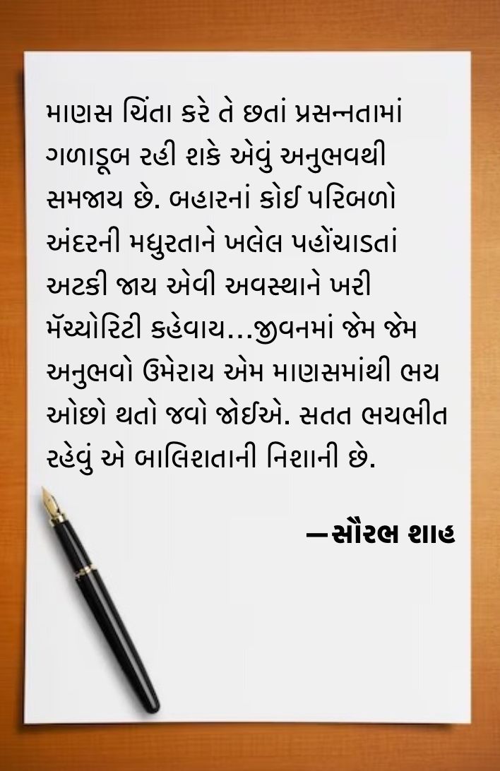 જીવનમાં જેમ જેમ અનુભવો ઉમેરાય એમ માણસમાંથી ભય ઓછો થતો જવો જોઈએ. સતત ભયભીત રહેવું એ બાલિશતાની નિશાની છે. પણ ભયથી દૂર થવું એટલે નિશ્ચિંત થઈ જવું કે સલામતી અનુભવવી એવું નહીં; અસલામતીમાં જીવવા છતાં અને અસલામતીભર્યા જીવનની સાથોસાથ ચાલી આવતી અનિશ્ચિતતાની થ્રિલ માણતાં રહીને જીવતા નીડર લોકો તમે જોયા હશે. એમની પાસે ડરવાનું કોઈ કારણ નથી હોતું, કારણ કે ભવિષ્યની કલ્પનાઓ એમને ડરામણી લાગતી નથી.