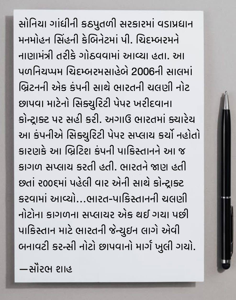 વાતની શરૂઆત 2006થી કરવી પડે. સોનિયા ગાંધીની કઠપુતળી સરકારમાં વડાપ્રધાન મનમોહન સિંહની કેબિનેટમાં પી. ચિદમ્બરમને નાણામંત્રી તરીકે ગોઠવવામાં આવ્યા હતા. આ પળનિયપ્પમ ચિદમ્બરમસાહેબે 2006ની સાલમાં બ્રિટનની એક કંપની સાથે ભારતની ચલણી નોટ છાપવા માટેનો સિક્યુરિટી પેપર ખરીદવાના કોન્ટ્રાક્ટ પર સહી કરી. અગાઉ ભારતમાં ક્યારેય આ કંપનીએ સિક્યુરિટી પેપર સપ્લાય કર્યો નહોતો કારણકે આ બ્રિટિશ કંપની પાકિસ્તાનને આ જ કાગળ સપ્લાય કરતી હતી. ભારતને જાણ હતી છતાં ૨૦૦૬માં પહેલી વાર એની સાથે કોન્ટ્રાક્ટ કરવામાં આવ્યો. આ બ્રિટિશ કંપનીનું નામ ફ્રેંચ ભાષામાં હતું- Thomas De La Rue. ટોમસ દે લા રુ. ( ફ્રેન્ચમાં Rueનો ઉચ્ચાર હૃદયના ‘હૃ’ની નજીક થાય. પણ આપણે દે લા રુથી ચલાવીશું. આ એક ફ્રેન્ચ અટક છે જેનો અર્થ થાય (ફલાણી) ‘ગલીમાંથી આવનારો’. આપણે ત્યાં ગામ સાથે જોડાયેલી સરનેમ હોય એવું કંઈક. જોકે, આપણને આ બધા સાથે કંઈ લેવાદેવા નથી. માત્ર એટલી જ માહિતી પૂરતી છે કે ગલીના ગુંડા જેવી આ બદમાશ અને બદનામ એવી સડકછાપ કંપની પાસેથી અગાઉ ભારતે ક્યારેય સિક્યુરિટી પેપરનો સપ્લાય લીધો નહોતો. ભારતની ચલણી નોટો બનાવવા માટેનો કાગળ આપણે છેક પ્રથમ વિશ્વયુદ્ધના જમાનાથી બ્રિટનની ‘પોર્ટલ્સ લિમિટેડ’ પાસેથી લેતા આવ્યા છીએ અને પ્રસંગોપાત જર્મની-જાપાન તેમજ અન્ય દેશોની કંપની પાસેથી પણ સપ્લાય મગાવ્યો છે. ભારતની ૯૫ ટકા જરૂરિયાતનો માલ વિદેશથી આવતો હતો. પાંચ ટકા જેટલો માલ મધ્યપ્રદેશના હોશંગાબાદ (હવે નર્મદાપુરમ) સ્થિત સિક્યુરિટી પેપર મિલ (એસપીએમ)માંથી આવતો. આ મિલ 1968માં શરૂ થઈ જેમાં ‘પોર્ટલ્સ લિમિટેડ‘ જેવા વિશ્વાસુ સાથીની ટેક્નિકલ સલાહ લેવામાં આવી હતી.