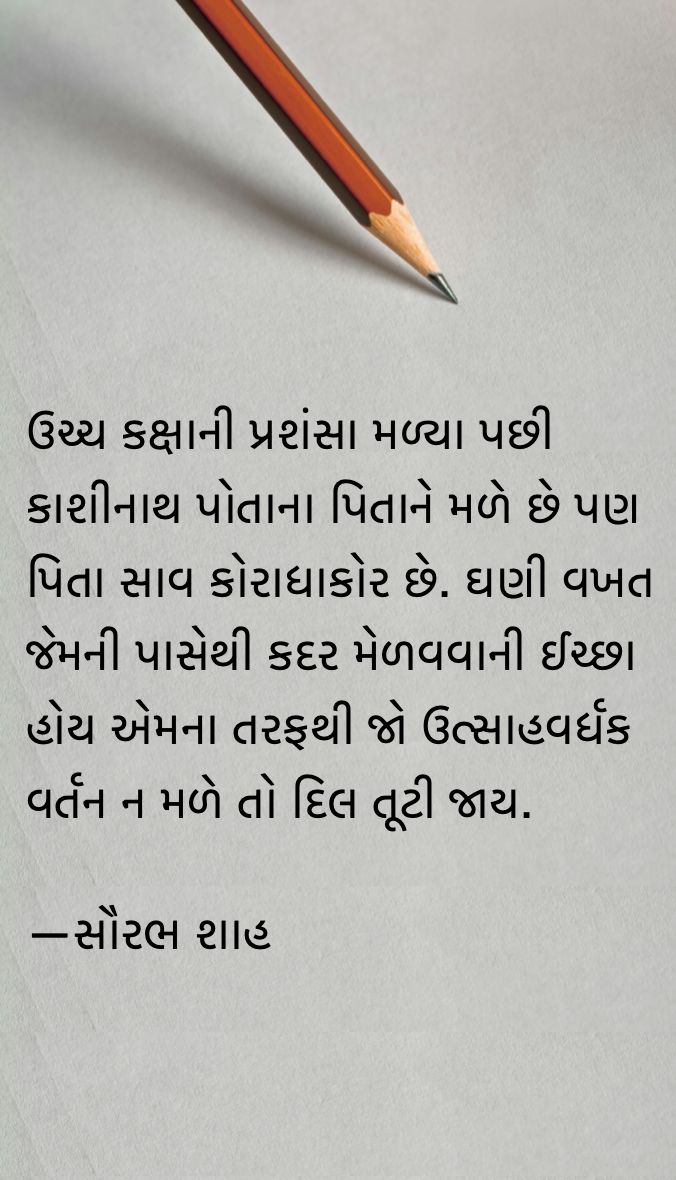 આવી ઉચ્ચ કક્ષાની પ્રશંસા મળ્યા પછી કાશીનાથ પોતાના પિતાને મળે છે પણ પિતા સાવ કોરાધાકોર છે. ઘણી વખત જેમની પાસેથી કદર મેળવવાની ઈચ્છા હોય એમના તરફથી જો ઉત્સાહવર્ધક વર્તન ન મળે તો દિલ તૂટી જાય. પુત્ર તરીકે કાશીનાથનું હૃદય તૂટી ગયું હતું.