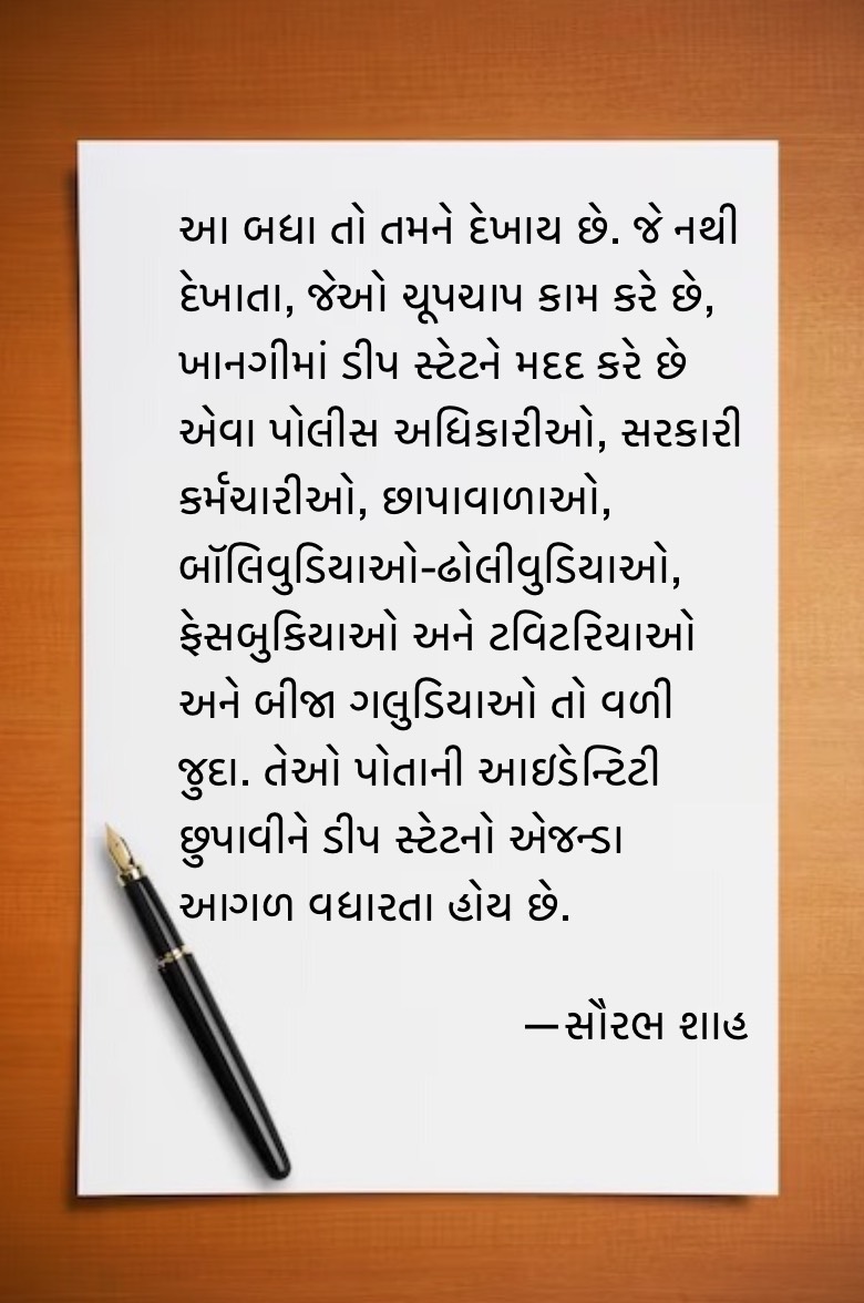 ડીપ સ્ટેટ શબ્દપ્રયોગ એવા લોકોના સમૂહ માટે વપરાય છે જે લોકો કોઈના કહેવાથી કે કોઈની દેખાદેખીથી કે પછી સ્વતંત્ર રીતે દેશને/સરકારને/શાસનને/સમાજને ઉધઈની જેમ ફોલી ખાવાની પ્રવૃત્તિ કરતા હોય. ભાંગફોડ કરીને અરાજકતા ફેલાવવાની પ્રવૃત્તિ કરતા હોય. સરકારની બ્યુરોક્રસીમાં, અધિકારી વર્ગ કે પછી અન્ય કર્મચારીગણમાં આવા માણસો હોય. મીડિયામાં, લશ્કરમાં, શિક્ષણના ક્ષેત્રમાં, સાંસ્કૃતિક ક્ષેત્રમાં, પ્રકાશન ક્ષેત્રમાં, ઈવન ગુજરાતી સાહિત્ય પરિષદ જેવી છુંછા જેવી સંસ્થાઓમાં અને તમારી જ્ઞાતિનું ભલું કરવાના ઇરાદે બનેલી સંસ્થામાં પણ ડીપ સ્ટેટ સાથે સંકળાયેલા લોકો હોય છે. ‘સંકળાયેલા’નો મતલબ એ નથી કે તેઓ સત્તાવાર કે બિનસત્તાવાર રીતે આવી પ્રવૃત્તિ કરનારા બીજા લોકો સાથે ‘સંકળાયેલા’ હોય કે એકબીજાને ઓળખતા પણ હોય. ડીપ સ્ટેટના અલ્ટીમેટ હેતુ સાથે તેઓ ‘સંકળાયેલા’ હોય છે અને તન અથવા મન અથવા ધન અથવા આ ત્રણેય દ્વારા ડીપ સ્ટેટના ગોલને સાકાર કરવાનું કામ તેઓ કરતા રહે છે.