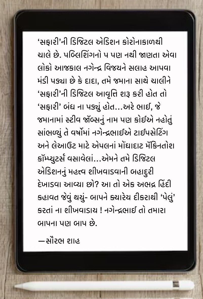 ‘સફારી’ની ડિજિટલ એડિશન કોરોનાકાળથી ચાલે છે. પબ્લિશિંગનો પ પણ નથી જાણતા એવા લોકો આજકાલ નગેન્દ્ર વિજયને સલાહ આપવા મંડી પડ્યા છે કે દાદા, તમે જમાના સાથે ચાલીને ‘સફારી’ની ડિજિટલ આવૃત્તિ શરૂ કરી હોત તો ‘સફારી’ બંધ ના પડ્યું હોત. કેટલાક તો વળી આગળ વધીને એમ પણ કહે છે કે હર્ષલભાઈ, તમે પિતાજીને ડિજિટલ એડિશન બનાવી આપો.