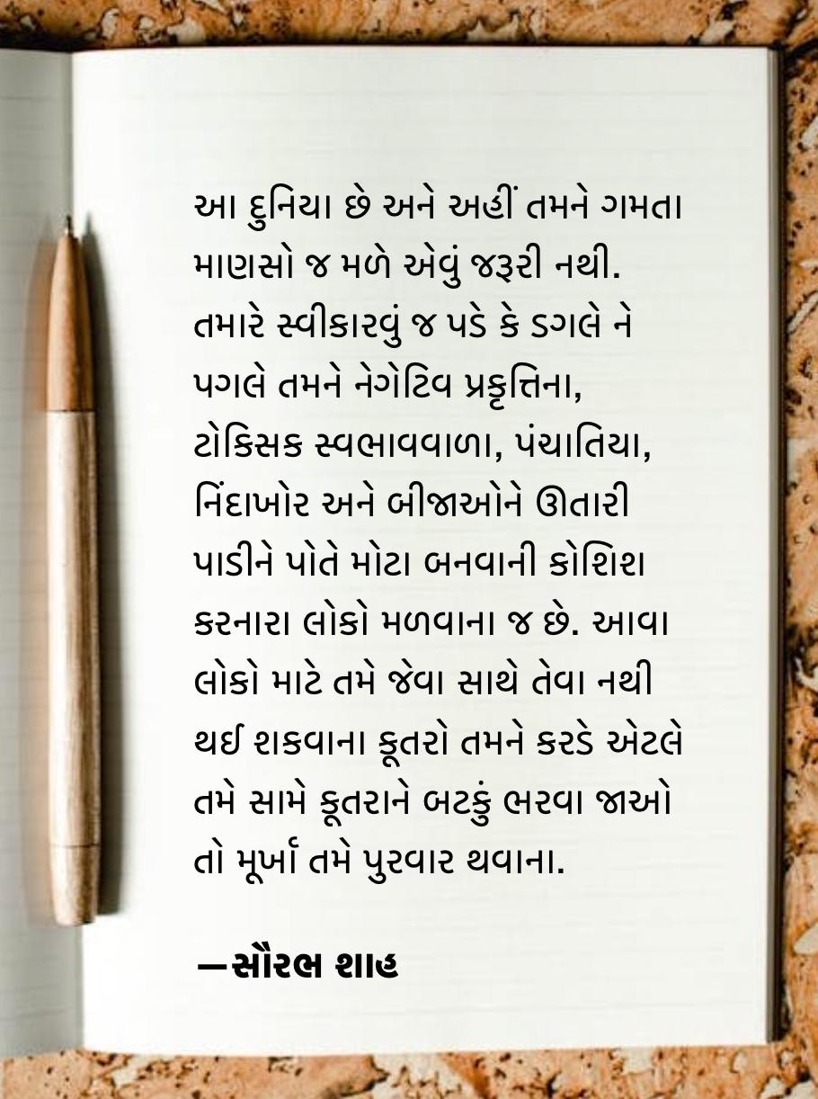 આ દુનિયા છે અને અહીં તમને ગમતા માણસો જ મળે એવું જરૂરી નથી. તમારે સ્વીકારવું જ પડે કે ડગલે ને પગલે તમને નેગેટિવ પ્રકૃત્તિના, ટોકિસક સ્વભાવવાળા, પંચાતિયા, નિંદાખોર અને બીજાઓને ઊતારી પાડીને પોતે મોટા બનવાની કોશિશ કરનારા લોકો મળવાના જ છે. આવા લોકો માટે તમે જેવા સાથે તેવા નથી થઈ શકવાના કૂતરો તમને કરડે એટલે તમે સામે કૂતરાને બટકું ભરવા જાઓ તો મૂર્ખા તમે પુરવાર થવાના.