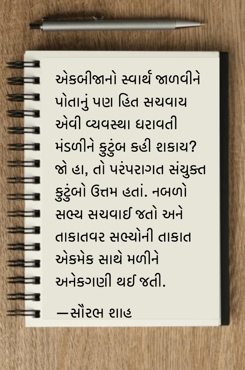 એકબીજાનો સ્વાર્થ જાળવીને પોતાનું પણ હિત સચવાય એવી વ્યવસ્થા ધરાવતી મંડળીને કુટુંબ કહી શકાય? જો હા, તો પરંપરાગત સંયુક્ત કુટુંબો ઉત્તમ હતાં. નબળો સભ્ય સચવાઈ જતો અને તાકાતવર સભ્યોની તાકાત એકમેક સાથે મળીને અનેકગણી થઈ જતી.