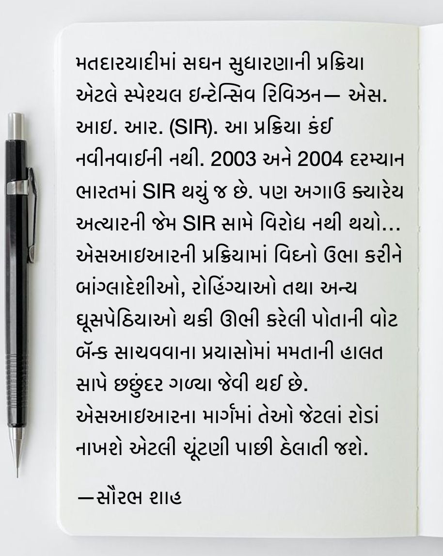 બિહારમાં એસઆઈઆરની પ્રક્રિયા શાંતિથી પતી ગઈ. બિહાર કરતાં ગુજરાતની વસ્તી લગભગ અડધી છે. બિહારમાં એસઆઇઆર વખતે બીએલઓની જવાબદારી નિભાવતા સરકારી શિક્ષકો તેમજ અન્ય સરકારી કર્મચારીઓ તરફથી શારીરિક/માનસિક અગવડો પડવાની કોઈ ફરિયાદ મળી નથી. ગુજરાતમાં જ કેમ? ગુજરાતમાં અમદાવાદના ચંડોળા તળાવ પરથી હજારો બાંગ્લાદેશી ઘૂસપેઠીયાઓની બસ્તી સફળતાપૂર્વક હટાવવામાં આવી. આ ઘૂસપેઠીયાઓ અને બંગાળ-આસામ જેવા સરહદી રાજ્યોમાંથી ગુજરાતમાં ઘૂસેલા વિદેશીઓ બંગાળમાં તૃણમૂલ કૉન્ગ્રેસની જેમ ગુજરાતમાં પણ કૉન્ગ્રેસ-‘આપ‘ની વોટ બૅન્ક બની જશે એવું સપનું શેખચલ્લી જેવા વિપક્ષી રાજનેતાઓ સેવી રહ્યા છે. એટલે જ એસઆઇઆરનો વિરોધ કરીને ગુજરાતના નાગરિકોને ભરમાવી રહ્યા છે.