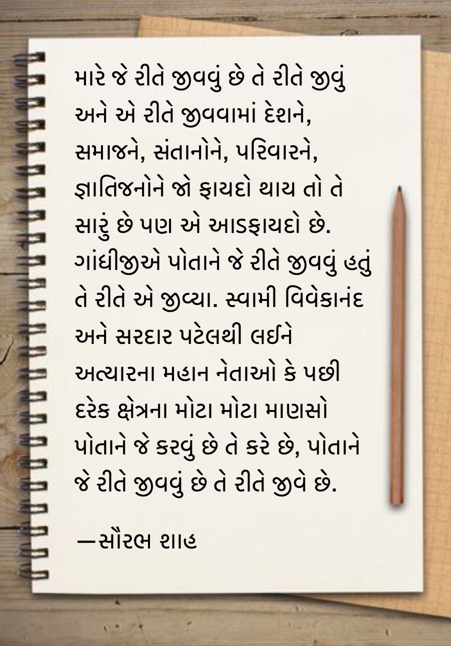 હકીકત એ છે કે મારે કોઈની અપેક્ષા પૂરી કરવાની નથી, મારે કોઈનું ભલું કરવાની નથી. ભગવાને મને મારી જિંદગી જીવવા માટે આ પૃથ્વી પર જન્મ આપ્યો છે. હું મારી રીતે જીવું, મારે જે રીતે જીવવું છે તે રીતે જીવું અને એ રીતે જીવવામાં દેશને, સમાજને, સંતાનોને, પરિવારને, જ્ઞાતિજનોને જો ફાયદો થાય તો તે સારું છે પણ એ આડફાયદો છે. ગાંધીજીએ પોતાને જે રીતે જીવવું હતું તે રીતે એ જીવ્યા. સ્વામી વિવેકાનંદ અને સરદાર પટેલથી લઈને અત્યારના મહાન નેતાઓ કે પછી દરેક ક્ષેત્રના મોટા મોટા માણસો પોતાને જે કરવું છે તે કરે છે, પોતાને જે રીતે જીવવું છે તે રીતે જીવે છે – રજનીશજીના શબ્દોમાં કહીએ તો, ‘પોતાની નિજતાનું સન્માન કરીને’ જીવે છે. આ નિજતા એટલે પોતાનું આગવું વ્યક્તિત્વ. કોઈ સંતુરવાદકને તમે કહો કે ચૂંટણી લડીને તમે લોકસભામાં આવી જાઓ, દેશ માટે ઉપયોગી થશો તો તમે મૂરખમાં ઠરશો. કોઈ રાજકારણીને તમે કહો કે તમે સંતૂર વગાડીને સંગીતની સાધના કરો તો પણ એટલા જ મૂરખ લાગશો. સચિન તેન્ડુલકરને રિલાયન્સના ચૅરમેન બનવાનું ન કહેવાય. મૂકેશ અંબાણીને પગે પૅડ બાંધીને મુંબઈ ઈન્ડિયન્સ વતી રમવા માટે સ્ટેડિયમમાં ન મોકલાય.