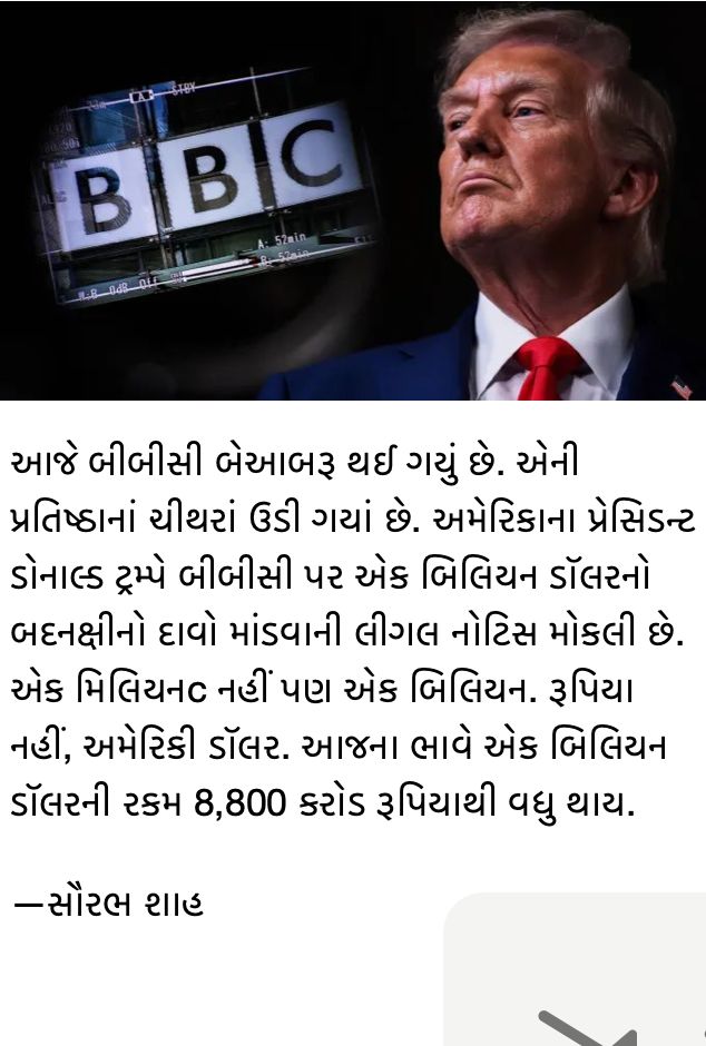 આજે બીબીસી બેઆબરૂ થઈ ગયું છે. એની પ્રતિષ્ઠાનાં ચીથરાં ઉડી ગયાં છે. અમેરિકાના પ્રેસિડન્ટ ડોનાલ્ડ ટ્રમ્પે બીબીસી પર એક બિલિયન ડૉલરનો બદનક્ષીનો દાવો માંડવાની લીગલ નોટિસ મોકલી છે. એક મિલિયન નહીં પણ એક બિલિયન. રૂપિયા નહીં, અમેરિકી ડૉલર. આજના ભાવે એક બિલિયન ડૉલરની રકમ 8,800 કરોડ રૂપિયાથી વધુ થાય.