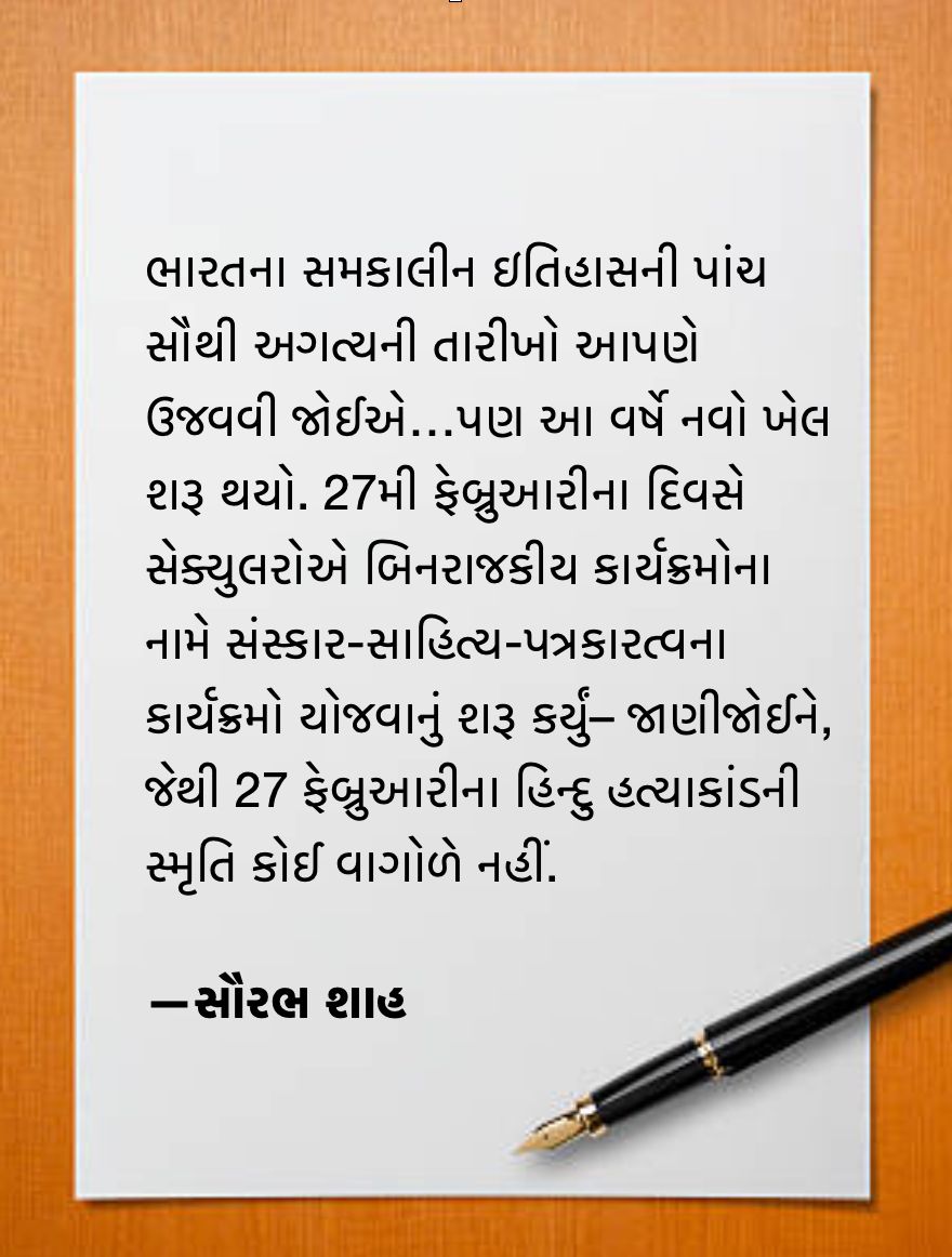 આ સેક્યુલર પ્રજા આગામી વર્ષોમાં આવા કંઇક ખેલ કરશે– 27 ફેબ્રુઆરી યાદદાસ્તમાંથી ભૂંસી નાખવા, છઠ્ઠી ડિસેમ્બર, પાંચમી ઑગસ્ટ, સાતમી મે અને બાવીસમી જાન્યુઆરીની પવિત્ર યાદગીરીને ભૂંસી નાખવા. એ લોકોનું ચાલે તો આ પાંચેય દિવસોને કૅલેન્ડરમાંથી જ કાઢી નાખે.
