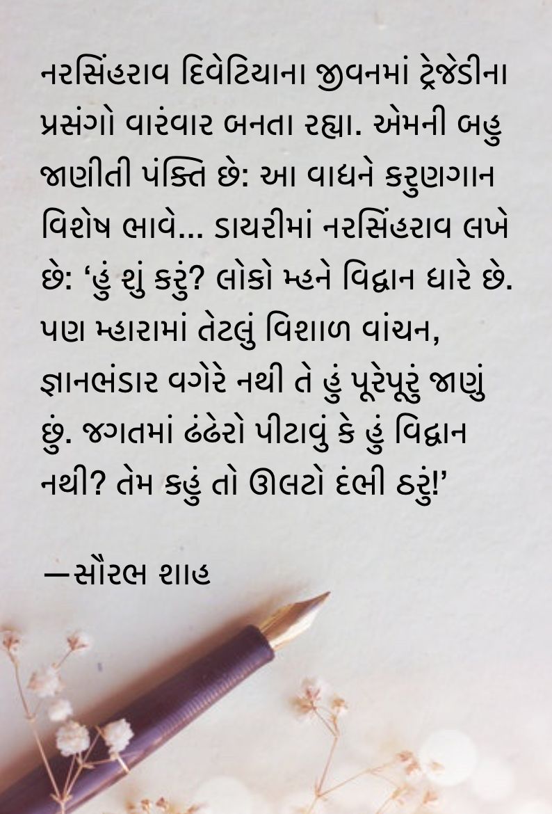 નરસિંહરાવ દિવેટિયાના જીવનમાં ટ્રેજેડીના પ્રસંગો વારંવાર બનતા રહ્યા. એમની બહુ જાણીતી પંક્તિ છે: આ વાદ્યને કરુણગાન વિશેષ ભાવે… ડાયરીમાં નરસિંહરાવ લખે છે: ‘હું શું કરું? લોકો મ્હને વિદ્વાન ધારે છે. પણ મ્હારામાં તેટલું વિશાળ વાંચન, જ્ઞાનભંડાર વગેરે નથી તે હું પૂરેપૂરું જાણું છું. જગતમાં ઢંઢેરો પીટાવું કે હું વિદ્વાન નથી? તેમ કહું તો ઊલટો દંભી ઠરું!’