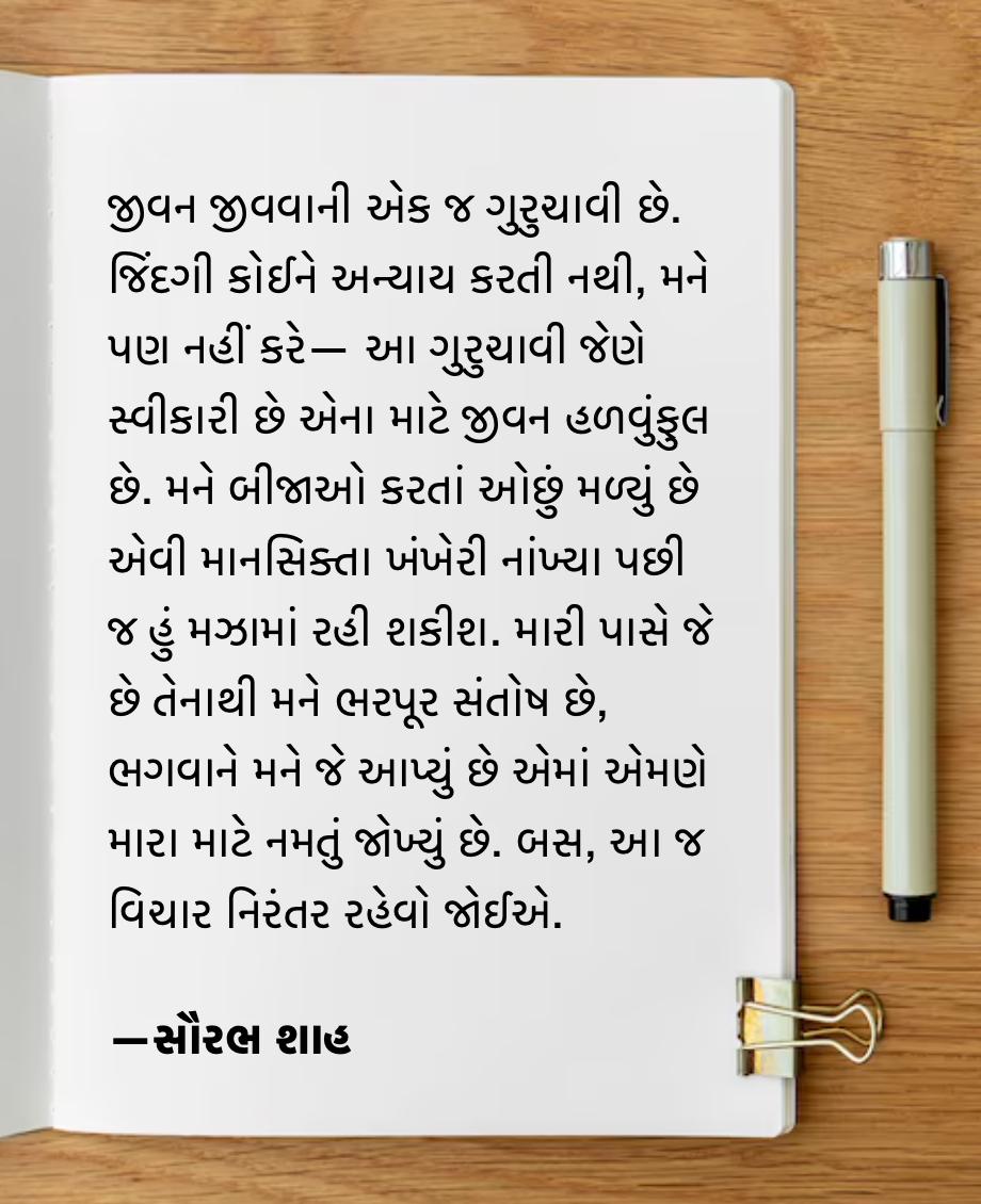 જીવન જીવવાની એક જ ગુરુચાવી છે. જિંદગી કોઈને અન્યાય કરતી નથી, મને પણ નહીં કરે- આ ગુરુચાવી જેણે સ્વીકારી છે એના માટે જીવન હળવુફૂલ છે. મને બીજાઓ કરતાં ઓછું મળ્યું છે એવી માનસિક્તા ખંખેરી નાંખ્યા પછી જ હું મઝામાં રહી શકીશ. મારી પાસે જે છે તેનાથી મને ભરપૂર સંતોષ છે, ભગવાને મને જે આપ્યું છે એમાં એમણે મારા માટે નમતું જોખ્યું છે. બસ, આ જ વિચાર નિરંતર રહેવો જોઈએ. બાકી લાખ થોથાં વાંચો અને કરોડો પ્રવચનો સાંભળો, કંઈ વળવાનું નથી.