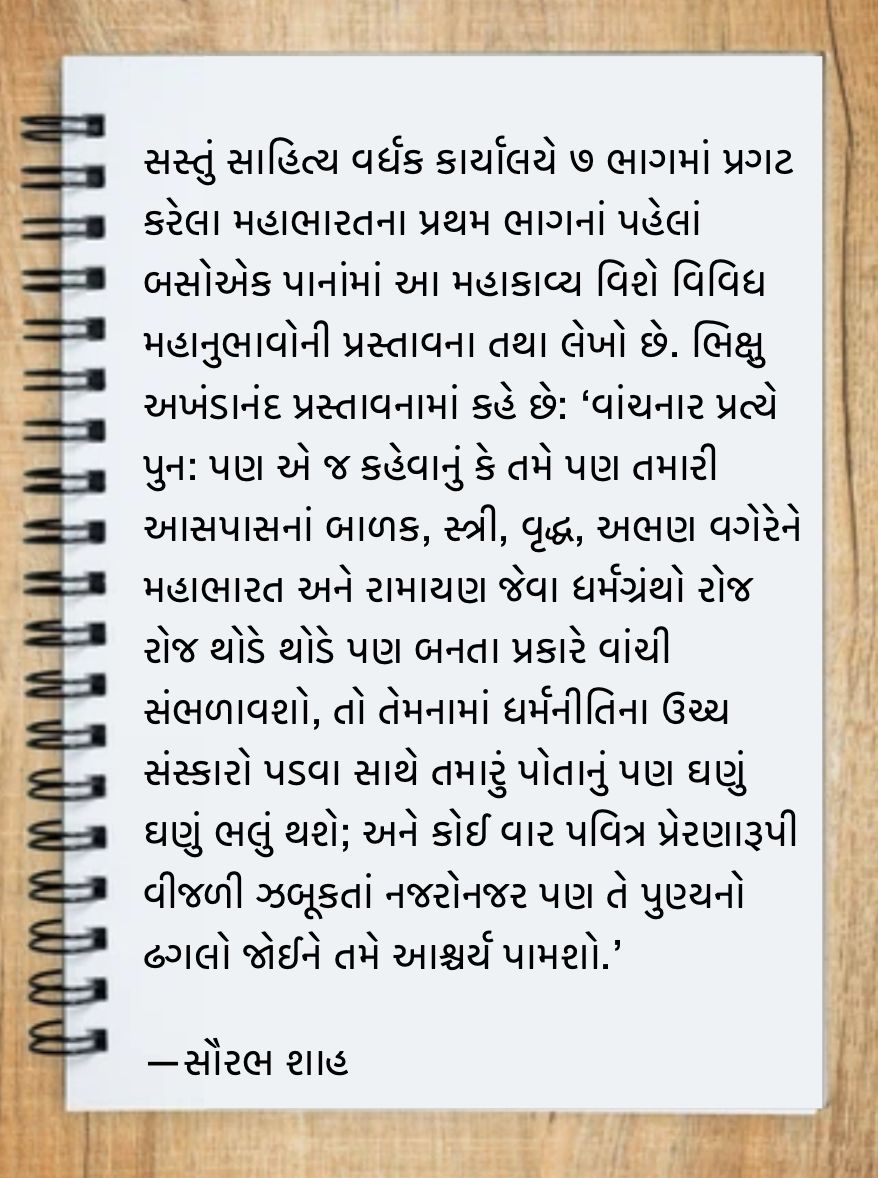 સસ્તું સાહિત્ય વર્ધક કાર્યાલયે ૭ ભાગમાં પ્રગટ કરેલા મહાભારતના પ્રથમ ભાગનાં પહેલાં બસોએક પાનાંમાં આ મહાકાવ્ય વિશે વિવિધ મહાનુભાવોની પ્રસ્તાવના તથા લેખો છે. ભિક્ષુ અખંડાનંદ પ્રસ્તાવનામાં કહે છે: ‘વાંચનાર પ્રત્યે પુન: પણ એ જ કહેવાનું કે તમે પણ તમારી આસપાસનાં બાળક, સ્ત્રી, વૃદ્ધ, અભણ વગેરેને મહાભારત અને રામાયણ જેવા ધર્મગ્રંથો રોજ રોજ થોડે થોડે પણ બનતા પ્રકારે વાંચી સંભળાવશો, તો તેમનામાં ધર્મનીતિના ઉચ્ચ સંસ્કારો પડવા સાથે તમારું પોતાનું પણ ઘણું ઘણું ભલું થશે; અને કોઈ વાર પવિત્ર પ્રેરણારૂપી વીજળી ઝબૂકતાં નજરોનજર પણ તે પુણ્યનો ઢગલો જોઈને તમે આશ્ચર્ય પામશો.’