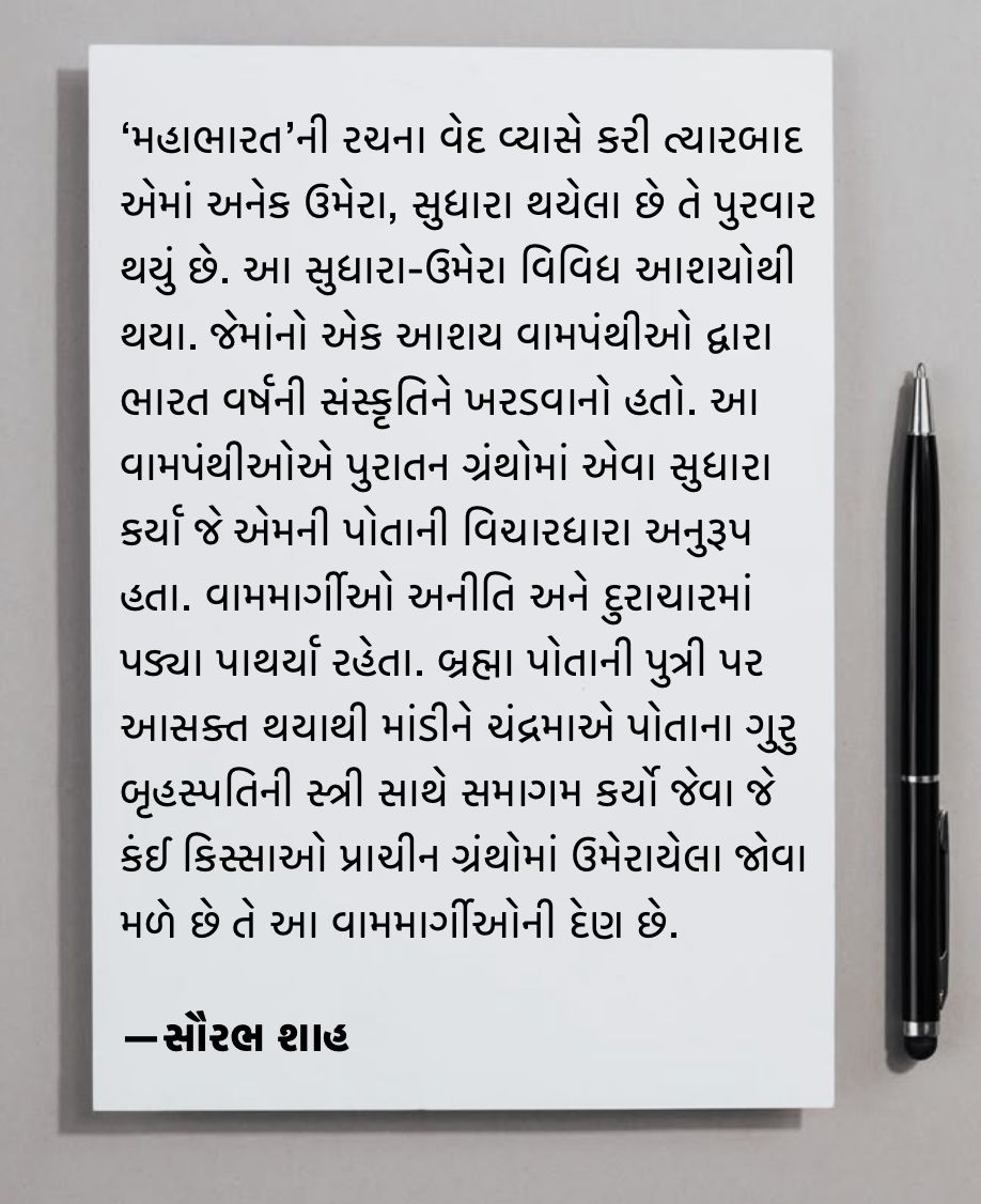 બીજું, ‘મહાભારત’ની રચના વેદ વ્યાસે કરી ત્યારબાદ એમાં અનેક ઉમેરા, સુધારા થયેલા છે તે પુરવાર થયું છે. આ સુધારા-ઉમેરા વિવિધ આશયોથી થયા. જેમાંનો એક આશય વામપંથીઓ દ્વારા ભારત વર્ષની સંસ્કૃતિને ખરડવાનો હતો. આ વામપંથીઓએ પુરાતન ગ્રંથોમાં એવા સુધારા કર્યા જે એમની પોતાની વિચારધારા અનુરૂપ હતા. વામમાર્ગીઓ અનીતિ અને દુરાચારમાં પડ્યા પાથર્યા રહેતા. બ્રહ્મા પોતાની પુત્રી પર આસક્ત થયાથી માંડીને ચંદ્રમાએ પોતાના ગુરુ બૃહસ્પતિની સ્ત્રી સાથે સમાગમ કર્યો જેવા જે કંઈ કિસ્સાઓ પ્રાચીન ગ્રંથોમાં ઉમેરાયેલા જોવા મળે છે તે આ વામમાર્ગીઓની દેણ છે.