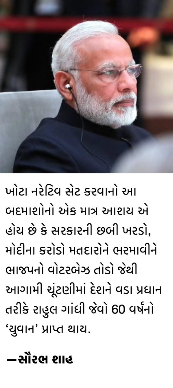 ખોટા નરેટિવ સેટ કરવાનો આ બદમાશોનો એક માત્ર આશય એ હોય છે કે સરકારની છબી ખરડો, મોદીના કરોડો મતદારોને ભરમાવીને ભાજપનો વોટરબેઝ તોડો જેથી આગામી ચૂંટણીમાં દેશને વડા પ્રધાન તરીકે રાહુલ ગાંધી જેવો 60 વર્ષનો ‘યુવાન’ પ્રાપ્ત થાય.