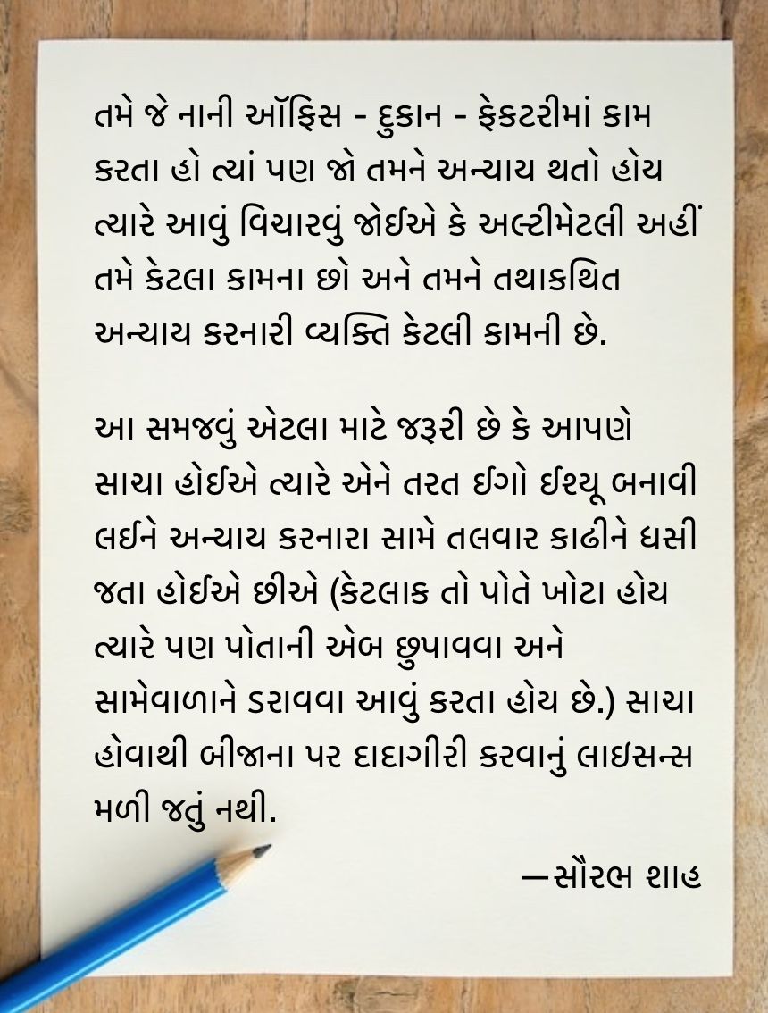 સામાજિક કાર્યોમાં પણ આવું બની શકે. તમે જે નાની ઑફિસ – દુકાન – ફેકટરીમાં કામ કરતા હો ત્યાં પણ જો તમને અન્યાય થતો હોય ત્યારે આવું વિચારવું જોઈએ કે અલ્ટીમેટલી અહીં તમે કેટલા કામના છો અને તમને તથાકથિત અન્યાય કરનારી વ્યક્તિ કેટલી કામની છે.