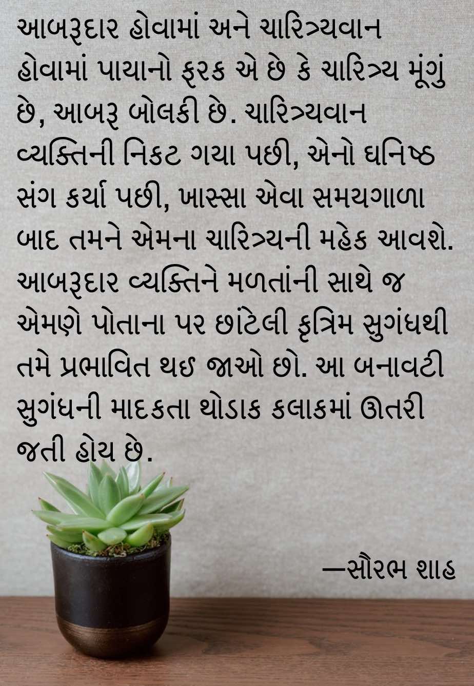 આબરૂદાર હોવામાં અને ચારિત્ર્યવાન હોવામાં પાયાનો ફરક એ છે કે ચારિત્ર્ય મૂંગું છે, આબરૂ બોલકી છે. ચારિત્ર્યવાન વ્યક્તિની નિકટ ગયા પછી, એનો ઘનિષ્ઠ સંગ કર્યા પછી, ખાસ્સા એવા સમયગાળા બાદ તમને એના ચારિત્ર્યની મહેક આવશે. આબરૂદાર વ્યક્તિને મળતાંની સાથે જ એણે પોતાના પર છાંટેલી કૃત્રિમ સુગંધથી તમે પ્રભાવિત થઈ જાઓ છો. આ બનાવટી સુગંધની માદકતાં થોડાક કલાકમાં ઊતરી જતી હોય છે.