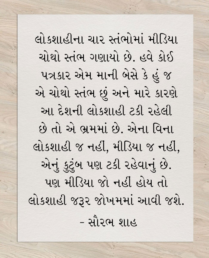 લોકશાહીના ચાર સ્તંભોમાં મીડિયા ચોથો સ્તંભ ગણાયો છે. હવે કોઈ પત્રકાર એમ માની બેસે કે હું જ એ ચોથો સ્તંભ છું અને મારે કારણે આ દેશની લોકશાહી ટકી રહેલી છે તો એ ભ્રમમાં છે. એના વિના લોકશાહી જ નહીં, મીડિયા જ નહીં, એનું કુટુંબ પણ ટકી રહેવાનું છે. પણ મીડિયા જો નહીં હોય તો લોકશાહી જરૂર જોખમમાં આવી જશે.
