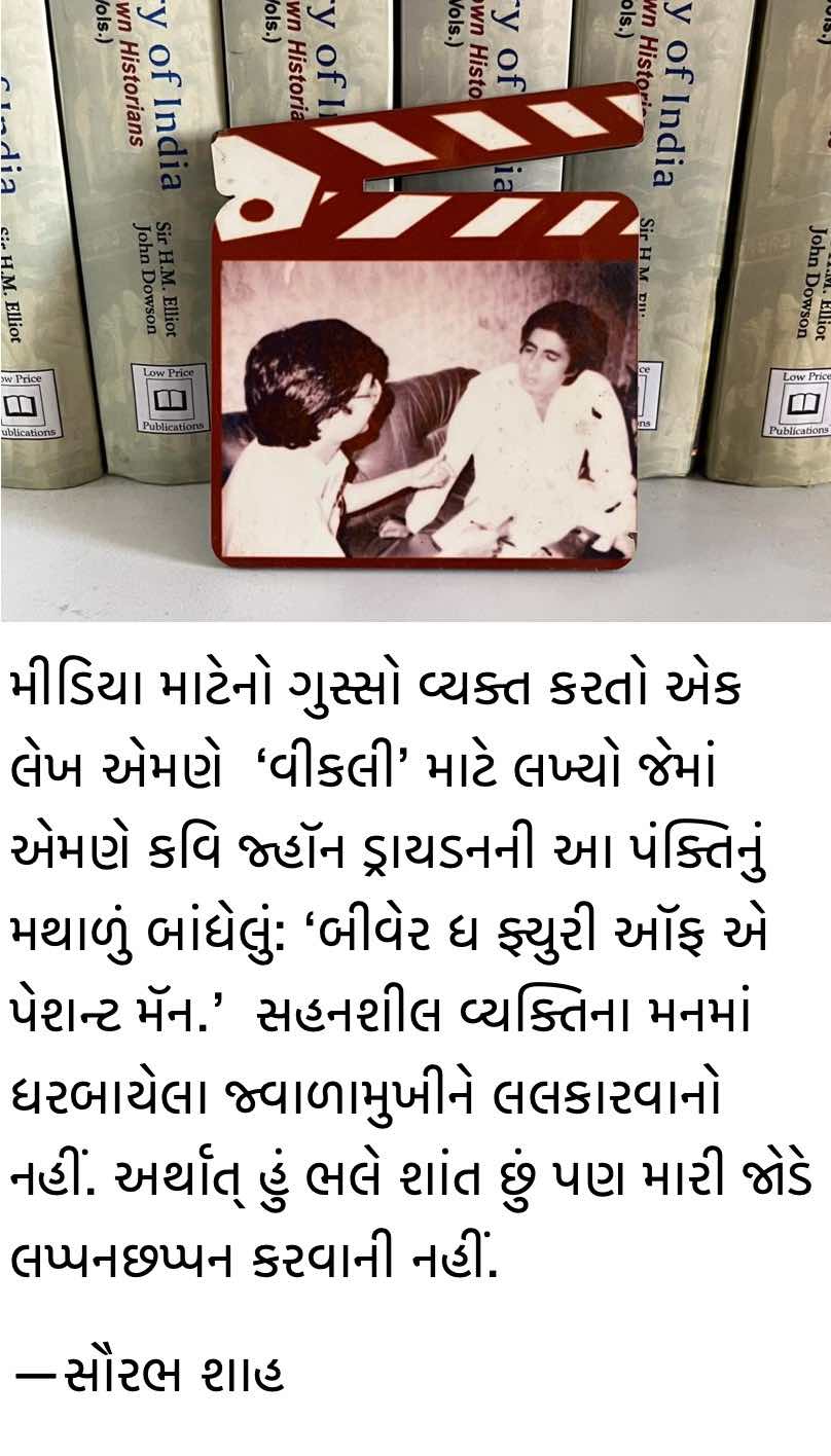 મીડિયા માટેનો ગુસ્સો વ્યક્ત કરતો એક લેખ એમણે ‘વીકલી’ માટે લખ્યો જેમાં એમણે કવિ જ્હૉન ડ્રાયડનની આ પંક્તિનું મથાળું બાંધેલું: ‘બીવેર ધ ફ્યુરી ઑફ એ પેશન્ટ મેન.’ સહનશીલ વ્યક્તિના મનમાં ધરબાયેલા જ્વાળામુખીને લલકારવાનો નહીં. અર્થાત્ હું ભલે શાંત છું પણ મારી જોડે લપ્પનછપ્પન કરવાની નહીં.