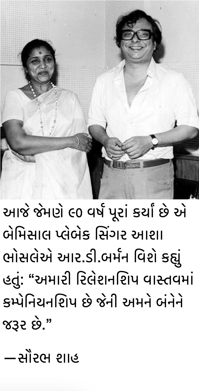 ‘આશા ભોસલે: અ મ્યુઝિકલ બાયોગ્રાફી’ (લેખક: રાજુ ભારતન, એક મહાન સિનિયર વર્સેટાઈલ પત્રકાર)માંથી એક જાણકારી પહેલી વાર મળી. ૧૯૭૫ની શરૂઆતના મહિના. ૧૯૭૨ની સાલમાં આશાજી ઓ.પી. નૈય્યર સાથે છેડો ફાડીને ‘મીરામાર’માંથી ફરી પાછા ‘પ્રભુ કુંજ’માં રહેવા આવી ગયા હતા. આ બાજુ આર.ડી. બર્મને રીટા પટેલ નામની ગુજરાતી યુવતી સાથે કરેલા લગ્ન બહુ ઓછા વખતમાં પડી ભાંગ્યા. આર.ડી. ઘર છોડીને મહિનાઓ સુધી ખારની ‘સીઝર્સ પેલેસ’ નામની હૉટેલમાં પર્મેનન્ટ રૂમ રાખીને રહેતા (મુંબઈના અંડરવર્લ્ડની ગૅન્ગે જે ધોળકિયાનું ખૂન કર્યું તેની માલિકીની આ હૉટેલ ખારમાં અમારી પ્યુપિલ્સ ઓન સ્કૂલથી વૉકિંગ ડિસ્ટન્સ પર હતી પણ એ વખતે આપણને ક્યાં એવી ખબર કે ભવિષ્યમાં અમે જેમની પૂજા કરવાના છીએ તે દેવતાએ એમનું કામચલાઉ મંદિર અહીં વસાવ્યું છે. એ જ રૂમ એમનો મ્યુઝિક રૂમ પણ ખરો).
