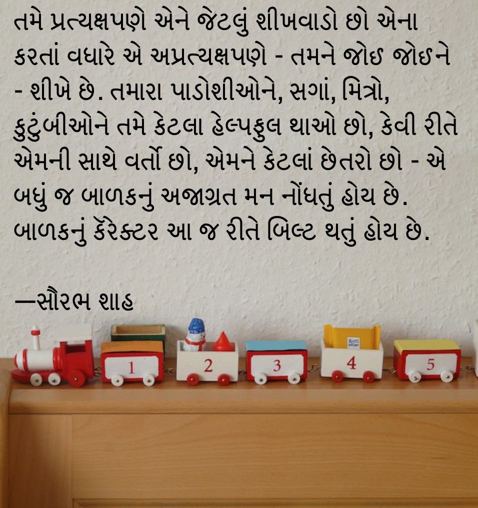 પ્લે સ્કૂલ, નર્સરી, કેજી અને પછી સ્કૂલમાં જતું થયેલું બાળક એની સાથેનાં બીજાં બાળકોની કેટલી મદદ કરે છે, એમની કેટલી દરકાર રાખે છે એનો આધાર તમે ઘરમાં એને આપેલાં સંસ્કાર ઉપર છે. તમે પ્રત્યક્ષપણે એને જેટલું શીખવાડો છો એના કરતાં વધારે એ અપ્રત્યક્ષપણે – તમને જોઈ જોઈને – શીખે છે. તમારા પાડોશીઓને, સગાં, મિત્રો, કુટુંબીઓને તમે કેટલા હેલ્પફુલ થાઓ છો, કેવી રીતે એમની સાથે વર્તો છો, એમને કેટલાં છેતરો છો – એ બધું જ બાળકનું અજાગ્રત મન નોંધતું હોય છે. બાળકનું કૅરેક્ટર આ જ રીતે બિલ્ટ થતું હોય છે. તમારી જો ફરિયાદ હોય કે મારું સંતાન ભારે કજિયાખોર છે તો તમારે તમારો સ્વભાવ પહેલાં તપાસવો પડે. તમારી ૧૪ વરસની છોકરી વંઠી ગઈ છે એવું લાગતું હોય તો પહેલાં તમારે તમારું કૅરેક્ટર તપાસવું પડે. કૉલેજમાં ભણતા તમારા દીકરાનો વૉર્ડરોબ સાફ કરતાં તમને એમાંથી કન્ડોમ્સના પૅકેટ્સ મળી આવે તો એનો કાન પકડતાં પહેલાં તમારે તમારો ભૂતકાળ અને વર્તમાન ચેક કરવો પડે. એને ઠપકો આપવાથી કંઈ નહીં વળે.
