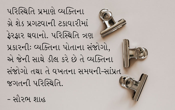 પરિસ્થિતિ પ્રમાણે પણ વ્યક્તિના ગ્રે શેડ પ્રગટવાની ટકાવારીમાં ફેરફાર થવાનો. પરિસ્થિતિ ત્રણ પ્રકારની વ્યક્તિના પોતાના સંજોગો, એ જેની સાથે ડીલ કરે છે તેના સંજોગો તથા તે વખતના સમયની, સાંપ્રત જગતની પરિસ્થિતિ.