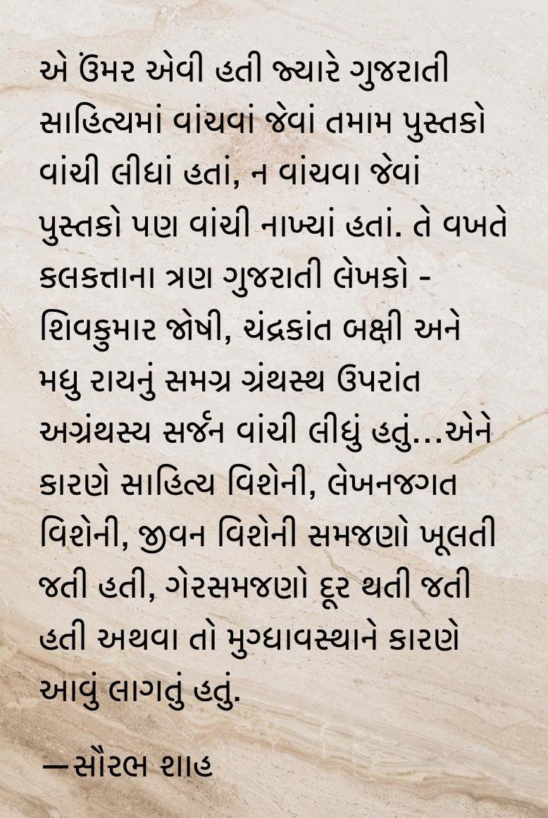 એ ઉંમર એવી હતી જ્યારે ગુજરાતી સાહિત્યમાં વાંચવાં જેવાં તમામ પુસ્તકો વાંચી લીધાં હતાં, ન વાંચવા જેવાં પુસ્તકો પણ વાંચી નાખ્યાં હતાં. તે વખતે કલકત્તાના ત્રણ ગુજરાતી લેખકો – શિવકુમાર જોષી, ચંદ્રકાંત બક્ષી અને મધુ રાયનું સમગ્ર ગ્રંથસ્થ ઉપરાંત અગ્રંથસ્ય સર્જન વાંચી લીધું હતું. એમનાં પુસ્તકો વિશે કે એમના પોતાના વિશે સાહિત્યિક સામયિકોમાં જે કંઈ છપાયું હોય તેની નોંધ લીધી હતી. આ તમામ વાચન મનમાં ઘૂંટાતું હતું અને એને કારણે સાહિત્ય વિશેની, લેખનજગત વિશેની, જીવન વિશેની સમજણો ખૂલતી જતી હતી, ગેરસમજણો દૂર થતી જતી હતી અથવા તો મુગ્ધાવસ્થાને કારણે આવું લાગતું હતું.