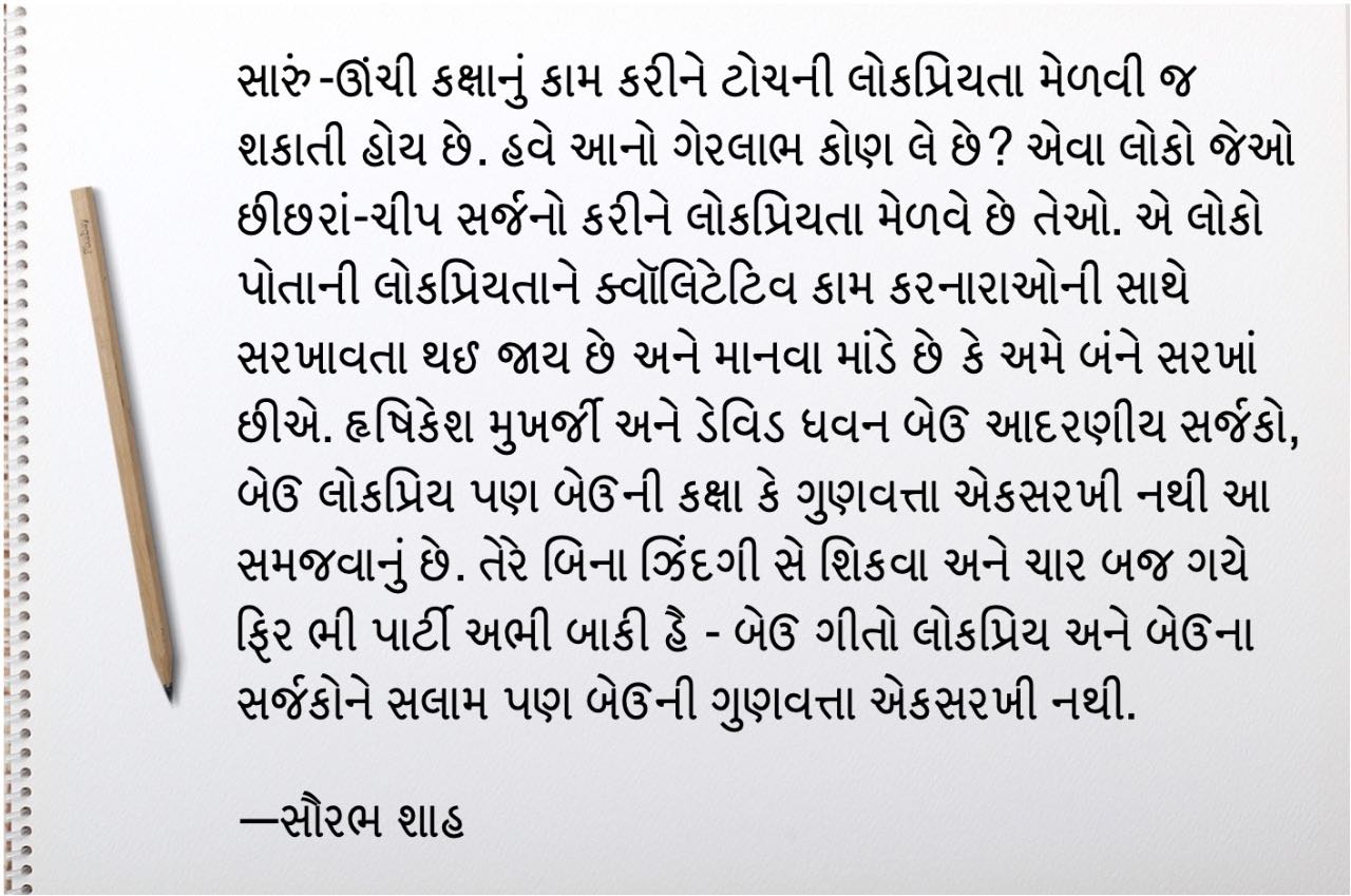પણ આપણે જોયું છે કે સારું-ઊંચી કક્ષાનું કામ કરીને ટોચની લોકપ્રિયતા મેળવી જ શકાતી હોય છે. હવે આનો ગેરલાભ કોણ લે છે? એવા લોકો જેઓ છીછરાં-ચીપ સર્જનો કરીને લોકપ્રિયતા મેળવે છે તેઓ. એ લોકો પોતાની લોકપ્રિયતાને ક્વૉલિટેટિવ કામ કરનારાઓની સાથે સરખાવતા થઈ જાય છે અને માનવા માંડે છે કે અમે બંને સરખાં છીએ. હૃષિકેશ મુખર્જી અને ડેવિડ ધવન બેઉ આદરણીય સર્જકો, બેઉ લોકપ્રિય પણ બેઉની કક્ષા કે ગુણવત્તા એકસરખી નથી આ સમજવાનું છે. તેરે બિના ઝિંદગી સે શિકવા અને ચાર બજ ગયે ફિર ભી પાર્ટી અભી બાકી હૈ – બેઉ ગીતો લોકપ્રિય અને બેઉના સર્જકોને સલામ પણ બેઉની ગુણવત્તા એકસરખી નથી. શરદચંદ્રની નવલકથાઓ અને ગુલશન નંદાની નવલકથાઓ બેઉ પોપ્યુલર અને બેઉ મોટા ગજાના લેખકો પણ કક્ષા બેઉની સરખી નથી. આવા તો કેટલાય દાખલા સર્જનના એ કળાના દરેક ક્ષેત્રમાં તમે આપી શકો.