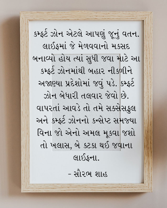 જ્યાં તમને એમ લાગે કે ગૂંગળામણ થઈ રહી છે ત્યાં કમ્ફર્ટ ઝોનમાંથી બહાર નીકળી જવું. જ્યાં તમને એમ લાગે કે સીમાઓની બહાર નીકળીને વધારે ગ્રોથ થાય એમ છે ત્યાં જરૂર કમ્ફર્ટ ઝોનની બહાર નીકળી જાઓ, બને એટલા વહેલા નીકળી જાઓ. પણ કશું સૂઝતું નથી એટલે કે પછી કંટાળો આવી રહ્યો છે એટલે અત્યારની સિસ્ટમોને તોડીફોડીને કે અત્યારના વાતાવરણને છોડીને બહાર નીકળી જવાથી કમ્ફર્ટ ઝોનમાંથી બહાર નીકળવાના ફાયદાઓ મળવાના નથી. બસ, આટલું જ યાદ રાખવાનું છે.