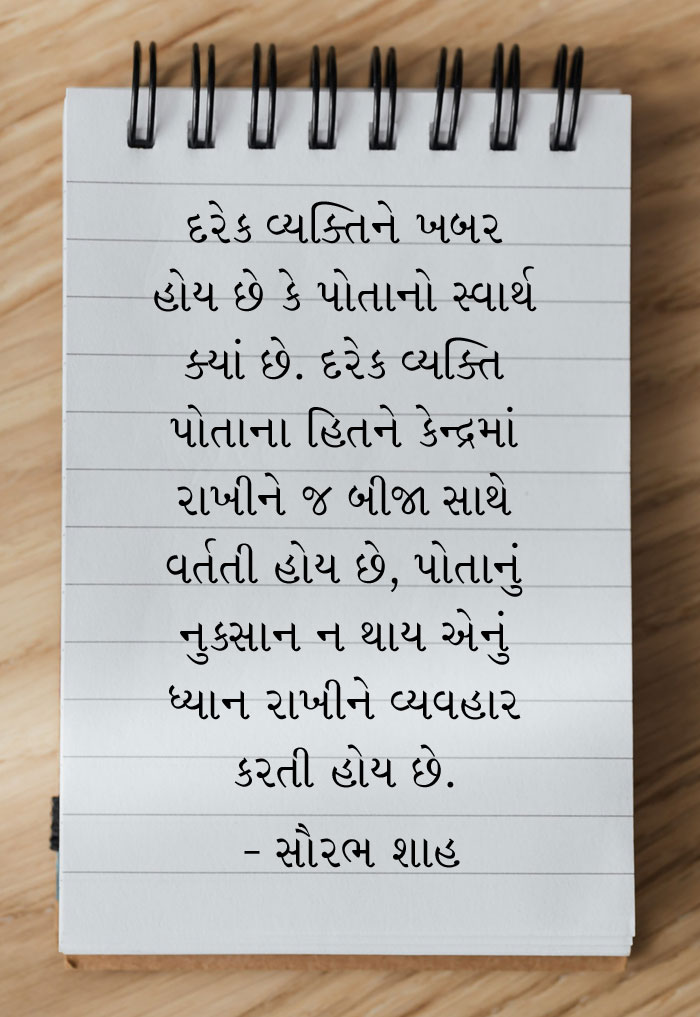 દરેક વ્યક્તિને ખબર હોય છે કે ઑન વિચ સાઈડ માય બ્રેડ ઈઝ બટર્ડ. મારો સ્વાર્થ ક્યાં છે. અને પોતાના સ્વાર્થને એટલે કે પોતાના હિતને કેન્દ્રમાં રાખીને જ દરેક વ્યક્તિ બીજા સાથે વર્તતી હોય છે, પોતાનું નુકસાન ન થાય એનું ધ્યાન રાખીને વ્યવહાર કરતી હોય છે. આ બધું ક્યારેક સભાનતાપૂર્વક અને ક્યારેક કોઈ જાતની સભાનતા કે આયાસ-પ્રયાસો વિના થતું હોય છે.