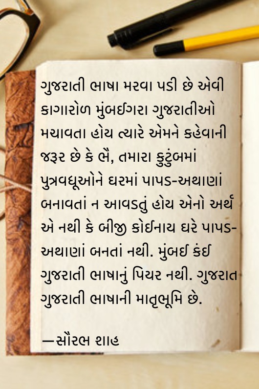ગુજરાતી ભાષા મરવા પડી છે એવી કાગારોળ મુંબઈગરા ગુજરાતીઓ મચાવતા હોય ત્યારે એમને કહેવાની જરૂર છે કે ભૈ, તમારા કુટુંબમાં પુત્રવધૂઓને ઘરમાં પાપડ-અથાણાં બનાવતાં ન આવડતું હોય એનો અર્થ એ નથી કે બીજી કોઈનાય ઘરે પાપડ-અથાણાં બનતાં નથી. મુંબઈ કંઈ ગુજરાતી ભાષાનું પિયર નથી. ગુજરાત ગુજરાતી ભાષાની માતૃભૂમિ છે. એક જમાનામાં આફ્રિકા અને લંડનમાં પણ ગુજરાતી ભાષાની સ્કૂલો હતી. મુંબઈમાં પણ હતી. હવે બહુ ઓછી છે. આને કારણે કંઈ તમે એવું ન કહી શકો કે ગુજરાતી ભાષા મરવા પડી છે. માત્ર એટલું જ કહી શકો કે મુંબઈમાં (માત્ર મુંબઈમાં જ, ગુજરાતમાં નહીં.) ગુજરાતી ભાષાનું ચલણ ઘટતું જાય છે.