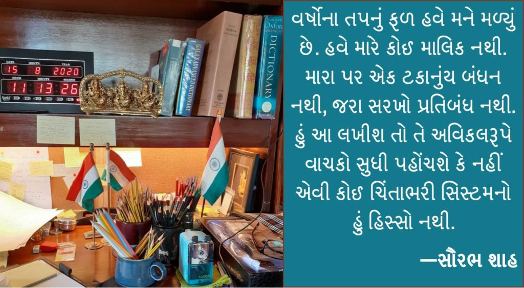 વર્ષોના તપનું ફળ હવે મને મળ્યું છે. હવે મારે કોઈ માલિક નથી. મારા પર એક ટકાનુંય બંધન નથી, જરા સરખો પ્રતિબંધ નથી. કાંટોં સે ખિંચ કે યે આંચલનું ગીત ગણગણતાં ‘આજ ફિર જીને કી તમન્ના હૈ’વાળું અતિ પ્રસન્ન વાતાવરણ મારા સ્ટડીરૂમ-કમ પુસ્તકાલયને ચોવીસે કલાક હર્યુંભર્યું રાખે છે. હું આ લખીશ તો તે અવિકલરૂપે વાચકો સુધી પહોંચશે કે નહીં એવી કોઈ ચિંતાભરી સિસ્ટમનો હું હિસ્સો નથી. હવે હું એમાંથી સંપૂર્ણપણે બહાર નીકળી ગયો છું. અવિકલ એટલે વિકલ ન હોય એવું. વિકલ એટલે કળા વિનાનું અથવા તો સંપૂર્ણ ન હોય, ખંડિત કે અપૂર્ણ હોય એવું. સ્વામી સચ્ચિદાનંદે ત્રણેક દાયકા પહેલાં મને આ શબ્દ આપ્યો. જેનું અંગ વિકલ હોય તે વિકલાંગ કહેવાય (હવે દિવ્યાંગ). અવિકલનો અર્થ થાય અનએડિટેડ. તમે જે લખ્યું છે એમાં એક પણ મુદ્દો, ફકરો, વાક્ય કે શબ્દની કાપકૂપ કર્યા વિના જે લખાણ છપાય તે અવિકલ હોય.