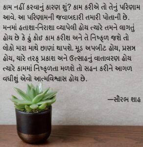 કામ નહીં કરવાનું કારણ શું? કામ કરીએ તો તેનું પરિણામ આવે. આ પરિણામની જવાબદારી તમારી પોતાની છે. મનમાં હતાશા-નિરાશા વ્યાપેલી હોય ત્યારે તમને લાગતું હોય છે કે હું કોઈ કામ કરીશ અને તે નિષ્ફળ જશે તો લોકો મારા માથે છાણાં થાપશે. મૂડ અપબીટ હોય, પ્રસન્ન હોય, ચારે તરફ પ્રકાશ અને ઉત્સાહનું વાતાવરણ હોય ત્યારે કામમાં નિષ્ફળતા મળશે તો સહન કરીને આગળ વધીશું એવો આત્મવિશ્વાસ હોય છે. પણ મનમાં જ્યારે કાળાં વાદળો ઘેરાયેલાં હોય ત્યારે મોટાભાગના લોકો જવાબદારી લેવાથી દૂર ભાગતા ફરે છે. જવાબદારી ઉપાડ્યા પછી એ નિભાવી શકાશે કે કેમ, નિભાવવા જઈશું તે તે સારી રીતે પાર પડશે કે નહીં, સારી રીતે પાર પડશે તો એ સફળતાની બીજાઓને ઇર્ષ્યા થશે તો? આવી અનેક ચિંતાઓ જવાબદારીની વાત આવે ત્યારે ઊભી થતી હોય છે.