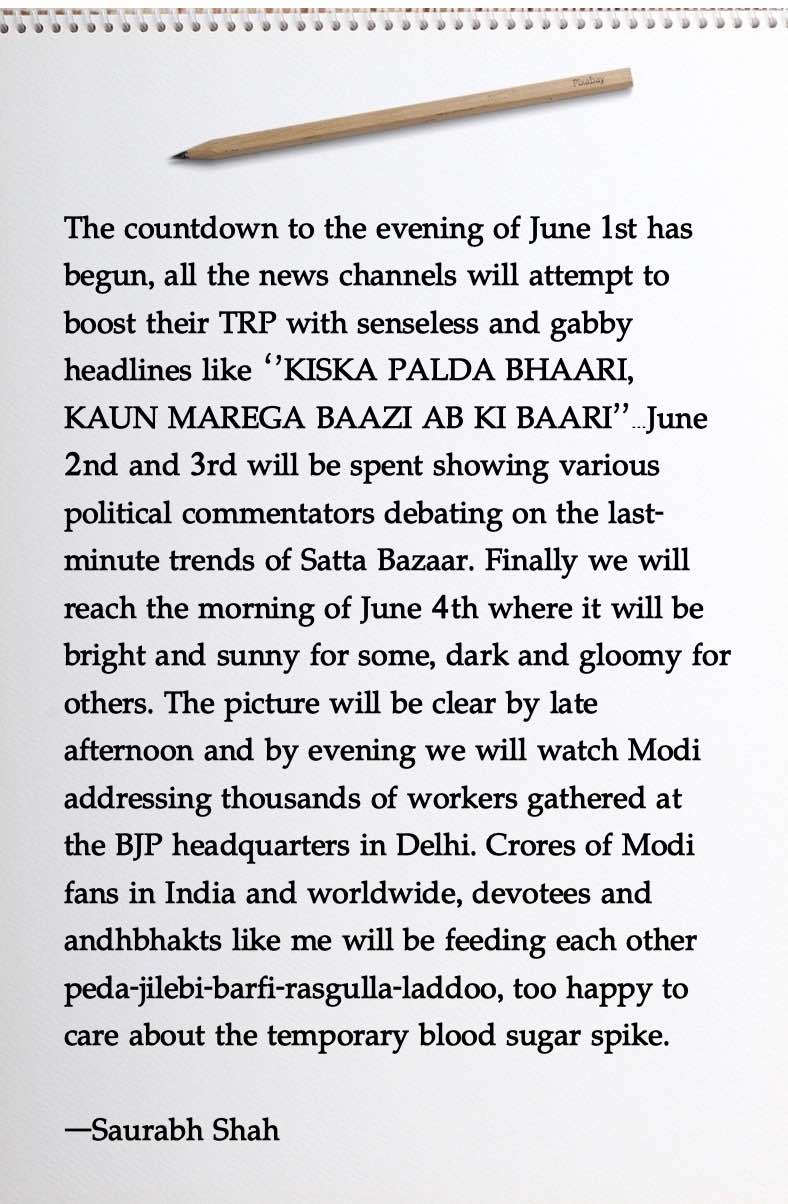 June 2nd and 3rd will be spent showing various political commentators debating on the last-minute trends of Satta Bazaar. Finally we will reach the morning of June 4th where it will be bright and sunny for some, dark and gloomy for others. The picture will be clear by late afternoon and by evening we will watch Modi addressing thousands of workers gathered at the BJP headquarters in Delhi. Crores of Modi fans in India and worldwide, devotees and andhbhakts like me will be feeding each other peda-jilebi-barfi-rasgulla-laddoo, too happy to care about the temporary blood sugar spike.