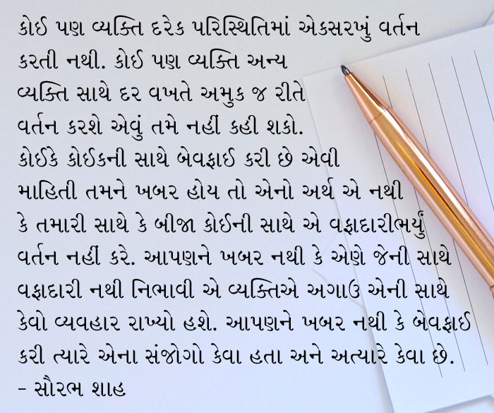 કોઈ પણ વ્યક્તિ દરેક પરિસ્થિતિમાં એકસરખું વર્તન કરતી નથી. કોઈ પણ વ્યક્તિ અન્ય વ્યક્તિ સાથે દર વખતે અમુક જ રીતે વર્તન કરશે એવું તમે નહીં કહી શકો. કોઈકે કોઈકની સાથે બેવફાઈ કરી છે એવી માહિતી તમને ખબર હોય તો એનો અર્થ એ નથી કે તમારી સાથે કે બીજા કોઈની સાથે એ વફાદારીભર્યું વર્તન નહીં કરે. આપણને ખબર નથી કે એણે જેની સાથે વફાદારી નથી નિભાવી એ વ્યક્તિએ અગાઉ એની સાથે કેવો વ્યવહાર રાખ્યો હશે. આપણને ખબર નથી કે બેવફાઈ કરી ત્યારે એના સંજોગો કેવા હતા અને અત્યારે કેવા છે.