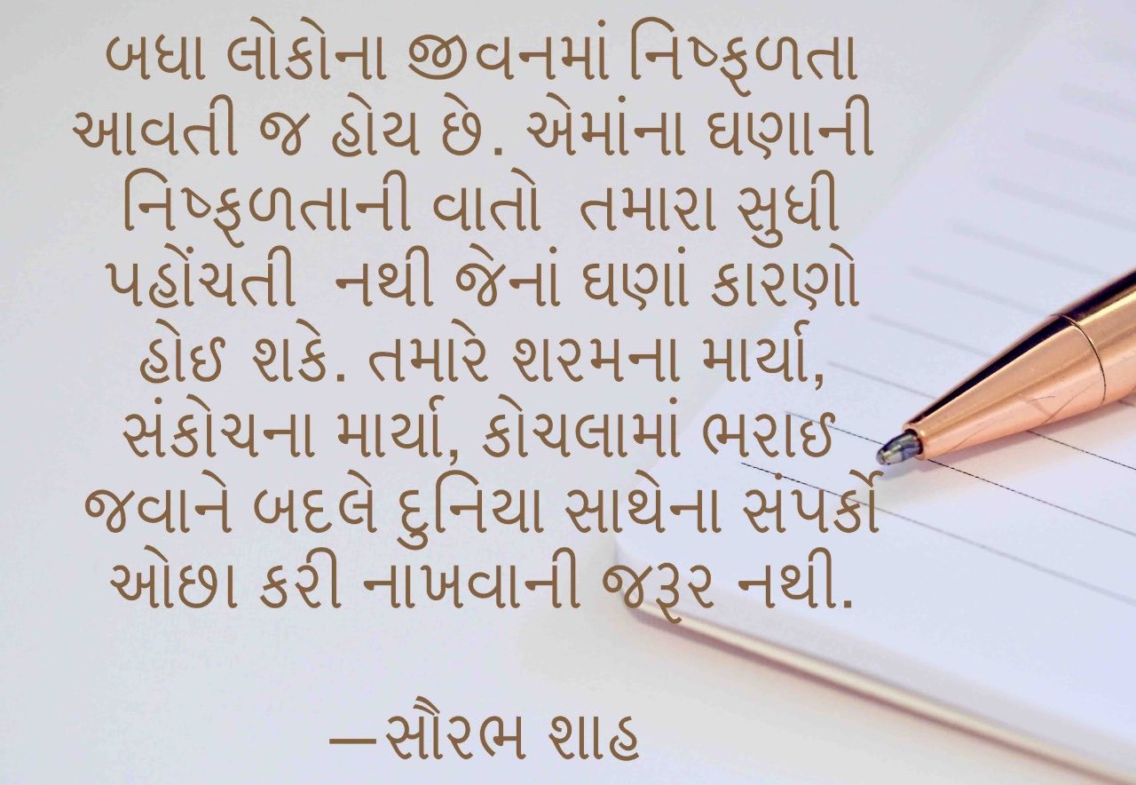 બધા લોકોના જીવનમાં નિષ્ફળતા આવતી જ હોય છે. એમાંના ઘણાની નિષ્ફળતાની વાતો તમારા સુધી પહોંચતી નથી જેનાં ઘણાં કારણો હોઈ શકે. તમારે શરમના માર્યા, સંકોચના માર્યા, કોચલામાં ભરાઈ જવાને બદલે દુનિયા સાથેના સંપર્કો ઓછા કરી નાખવાની જરૂર નથી. જીવનમાં સર્જાતો દરેક સંબંધ ઉપયોગી છે એ વાત ધ્યાનમાં રાખવી. નિષ્ફળતા પછીના ગાળામાં આ બધા જ સંબંધો ક્યાંક, કોઈક રીતે તમને કામ લાગવાના છે અને તમે પણ એ લોકોને અગાઉની જેમ જ ઉપયોગી થતા રહેવાના છો એ યાદ રાખવું.