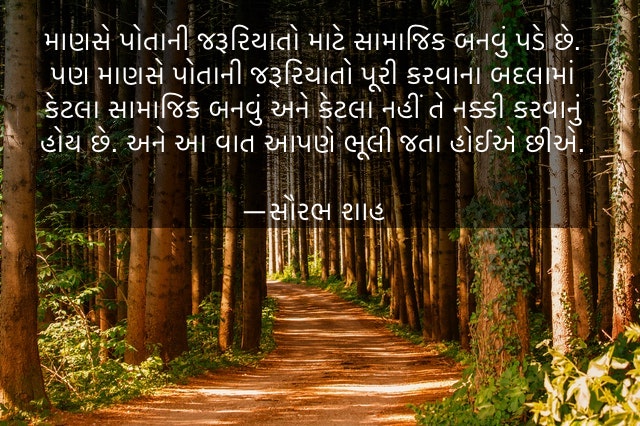 માણસે પોતાની જરૂરિયાતો માટે સામાજિક બનવું પડે છે. પણ માણસે પોતાની જરૂરિયાતો પૂરી કરવાના બદલામાં કેટલા સામાજિક બનવું અને કેટલા નહીં તે નક્કી કરવાનું હોય છે. અને આ વાત આપણે ભૂલી જતા હોઈએ છીએ. અને એટલે જ સામાજિક વ્યવહારોમાં તદ્દન બિનજરૂરી રીતે એટલા ઊડાં ખૂંપી જઈએ છીએ કે એમાંથી બહાર આવવાનો વિચાર પણ નથી આવતો, સામાજિક વ્યવહારોને સંતુલિત કરવાનો ખ્યાલ પણ નથી આવતો.