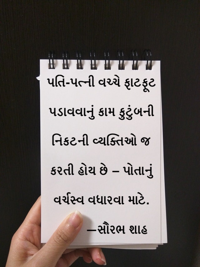 પતિ-પત્ની વચ્ચે ફાટફૂટ પડાવવાનું કામ કુટુંબની નિકટની વ્યક્તિઓ જ કરતી હોય છે – પોતાનું વર્ચસ્વ વધારવા માટે. આવી નજીકની વ્યક્તિઓથી સાવધ રહેવું. ક્યારેક બહારનાઓ પણ આવો પ્રયાસ કરે – જ્યારે તેઓ તમારી પત્ની કે તમારા પતિ સાથે આડા સંબંધ બાંધવાની ખ્વાહિશ રાખતા હોય ત્યારે.