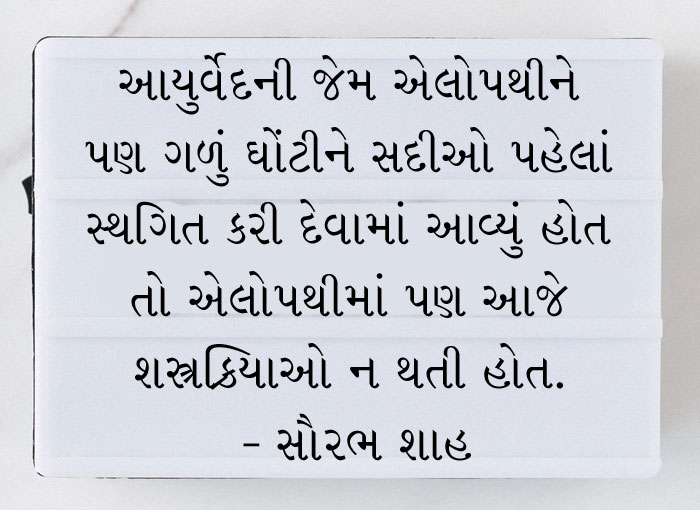 સંસ્કૃતમાં લખાયેલા આપણા આયુર્વેદના ગ્રંથોને ભુલાવી દેવાનું કાવતરું સૈકાઓ સુધી ચાલ્યું પણ નાકામિયાબ રહ્યું. આયુર્વેદની ચિકિત્સા પદ્ધતિમાં શસ્ત્રક્રિયા, દાંતની શલ્ય ચિકિત્સા ( એટલે કે ઑપરેશન કે સર્જરી કે પ્રોસિજર) વગેરે બધું જ થતું. પણ ક્રમશ: ભુલાઈ ગયું. એમાં આગળ સંશોધન ન થયું. એલોપથીવાળા કહેશે કે આયુર્વેદવાળા શું બાયપાસ સર્જરી કરી શકવાના હતા?