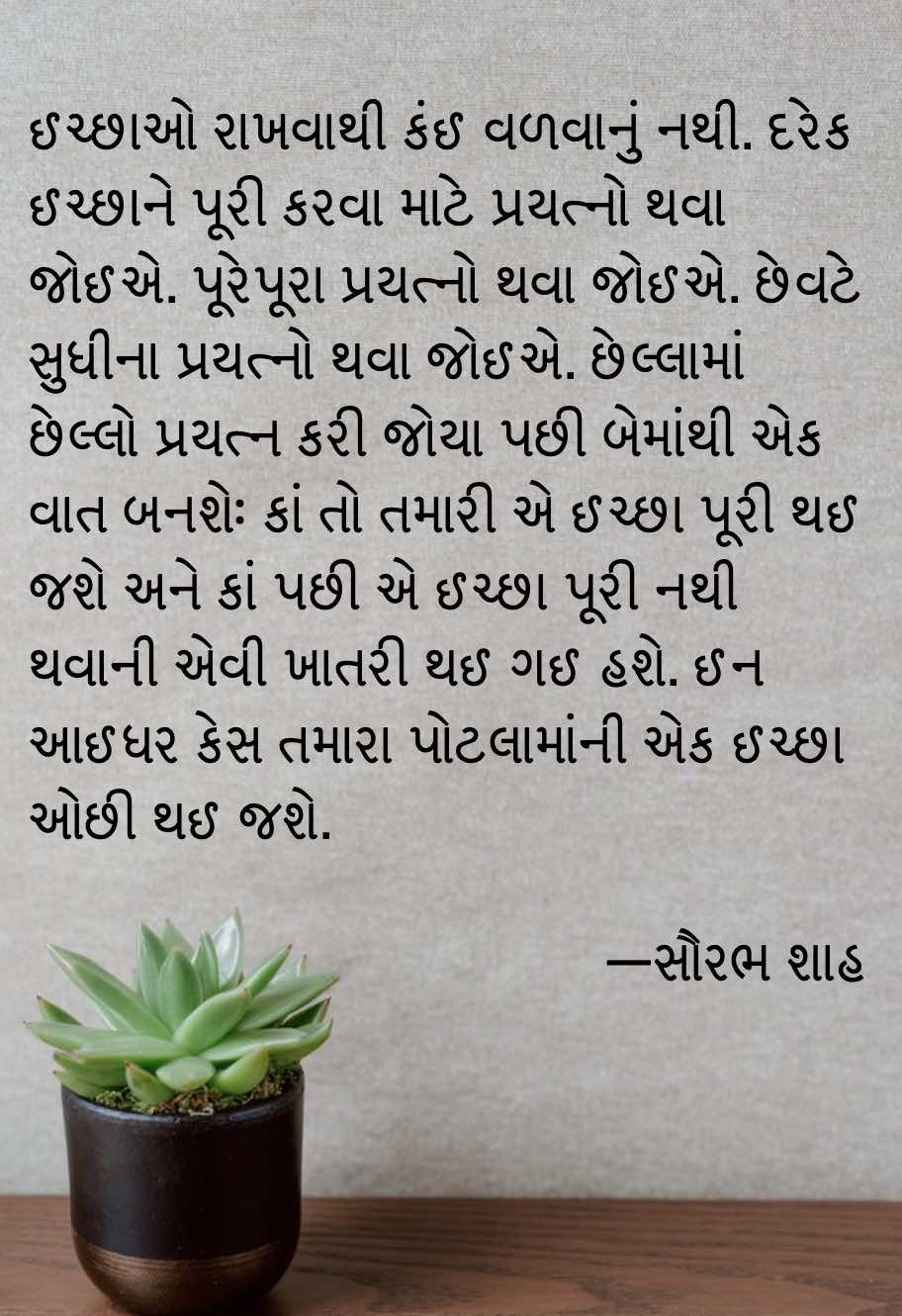 પ્રયત્નો કર્યા વિના કોઈપણ ઇચ્છા પૂરી થવાની નથી. પ્રયત્નો કર્યા વિના તમને ખબર પણ નથી પડવાની કે તમારી એ ઇચ્છા પૂરી થશે કે નહીં થાય. પ્રયત્નો કર્યા પછી, પૂરેપૂરા નીચોવાઈને પ્રયત્નો કર્યા પછી જ, કઈ ઇચ્છાનું પરિણામ શું આવવાનું છે એની ખબર પડે.