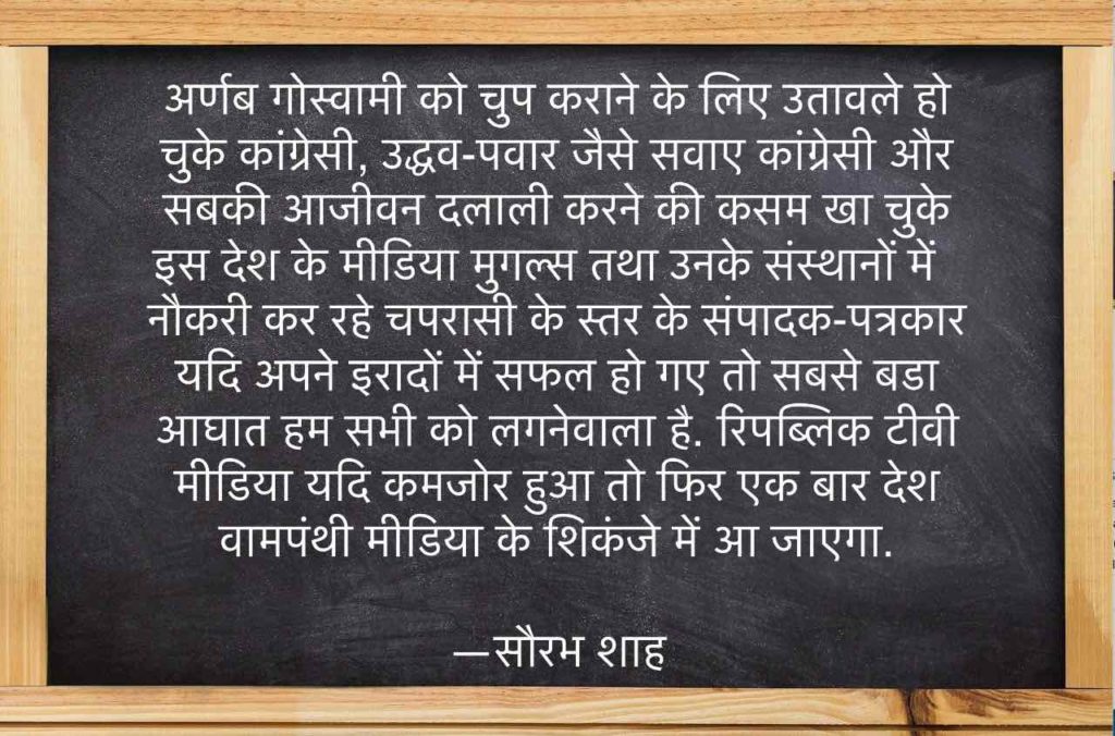 अर्णब गोस्वामी को चुप कराने के लिए उतावले हो चुके कांग्रेसी, उद्धव-पवार जैसे सवाए कांग्रेसी और सबकी आजीवन दलाली करने की कसम खा चुके इस देश के मीडिया मुगल्स तथा उनके संस्थानों में नौकरी कर रहे चपरासी के स्तर के संपादक-पत्रकार यदि अपने इरादों में सफल हो गए तो सबसे बडा आघात हम सभी को लगनेवाला है. रिपब्लिक टीवी मीडिया यदि कमजोर हुआ तो फिर एक बार देश वामपंथी मीडिया के शिकंजे में आ जाएगा. अर्णब गोस्वामी और रिपब्लिक टीवी पर जिस तरह से कांग्रेसी और भ्रष्ट मीडिया टूट पडे हैं, उसे देखकर बॉलिवुड की फिल्में याद आ जाती हैं जिनमें विलन की करतूत को जान चुके हीरो को धरकर दो दर्जन गुंडे मव्वाली मार मार कर अधमरा कर देते हैं.