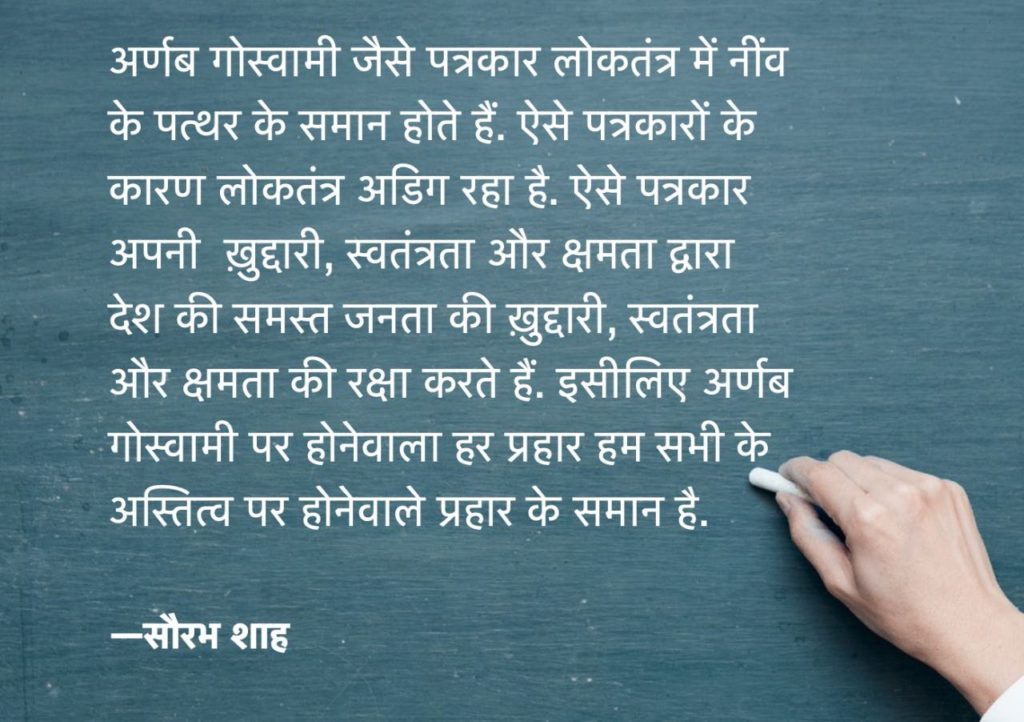 अर्णब गोस्वामी जैसे पत्रकार लोकतंत्र में नींव के पत्थर के समान होते हैं. ऐसे पत्रकारों के कारण लोकतंत्र अडिग रहा है. ऐसे पत्रकार अपनी ख़ुद्दारी, स्वतंत्रता और क्षमता द्वारा देश की समस्त जनता की ख़ुद्दारी, स्वतंत्रता और क्षमता की रक्षा करते हैं. इसीलिए अर्णब गोस्वामी पर होनेवाला हर प्रहार हम सभी के अस्तित्व पर होनेवाले प्रहार के समान है- यदि हम लोकतंत्र में मानते हैं तो, यदि हम ख़ुद्दारी से जीने में, अभिव्यक्ति की स्वतंत्रता में और अपने तथा अपने परिवार के अस्तित्व को अधिक से अधिक सक्षम बनाने चाहते हैं तो.