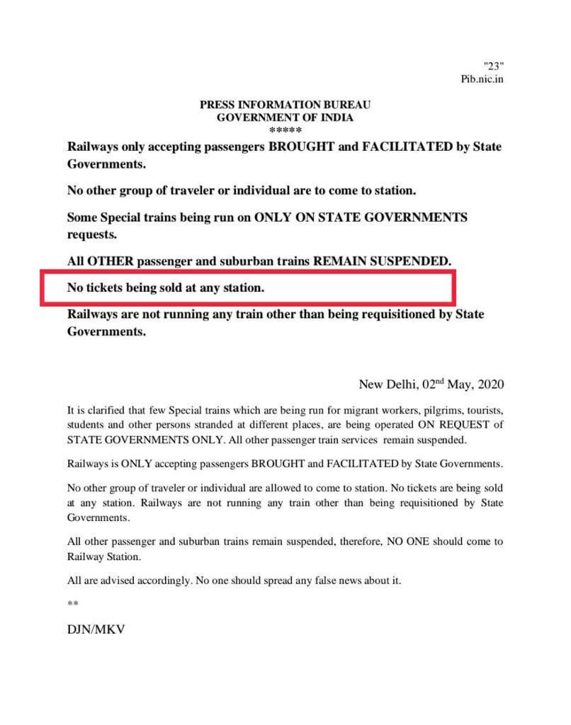 प्रेस इन्फॉर्मेशन ब्यूरो डॉट एनआईसी डॉट इन भारत सरकार की आधिकारिक वेबसाइट है जिस पर केंद्रीय गृह मंत्रालय के आदेश की प्रति भारत का कोई भी नागरिक पढ सकता है. आदेश में स्पष्ट लिखा है:“नो टिकट्स बींग सोल्ड ऐट एनी स्टेशन’.