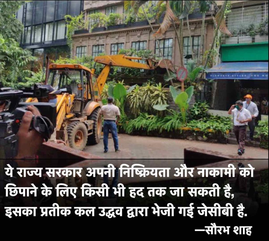 लोकतंत्र में नहीं बल्कि ठोकतंत्र में मानने वाली ये राज्य सरकार अपनी निष्क्रियता और नाकामी को छिपाने के लिए किसी भी हद तक जा सकती है, इसका प्रतीक कल उद्धव द्वारा भेजी गई जेसीबी है. बॉम्बे हाईकोर्ट ने उद्धव की इस हरकत को `बदइरादतन और खदजनक’ घोषित किया है. अनधिकृत निर्माण तोडना ही चाहिए और इसके लिए वर्षों तक प्रक्रिया चलती है ऐसा मुंबईवासियों ने देखा है. वॉर्डन रोड और पेडर रोड के जंक्शन पर बने `तिरुपति’ अपार्टमेंट पर निर्मित गैरकानूनी अतिरिक्त मंजिलों को तोडने की कानूनी कार्रवाई करने में बरसों बीत गए. महाराष्ट्र के पूर्व कांग्रेसी मुख्यमंत्री और उद्धव सरकार के सार्वजनिक निर्माण विभाग के मंत्री अशोक शंकरराव चव्हाण को जिस कॉन्ट्रोवर्सी के कारण मुख्यमंत्री का आसन छोडना पडा था, उस कोलाबा की प्राइम लोकेशन पर बनी आदर्श हाउसिंग सोसायटी के घोटाले के मूल में जो मुद्दे थे उसे पेड न्यूज द्वारा मीडिया में दबा दिया गया था, ऐसी शिकायत चव्हाण के चुनाव के दौरान इलेक्शन कमिशन में रखी गई थी. मुंबई की हजारों बहुमंजिला इमारतें, शॉपिंग सेंटर्स और लाखों झोपडियों के सामने अनधिकृत निर्माण के मामले हैं, लेकिन इन सभी में से एक कंगना राणावत पर ही निशाना लगाकर चौबीस घंटे के अंदर नोटिस देकर मालिक की गैरमौजूदगी में दर्जनों हथियारबंद पुलिस वालों को लेकर उद्धव ने महानगरपालिका से जेसीबी द्वारा जो काम करवाया है, उसके बाद मुंबईवासी ही नहीं, बल्कि सभी महाराष्ट्रीय लोग इस आदमी पर पांच पैसे का भी भरोसा नहीं करेंगे. भरोसा है तो एक बात का कि २०२४ या उससे पहले (यदि मध्यावधि चुनाव हों तो) महाराष्ट्र विधानसभा सभा चुनाव से पहले शिवसेना मुंबई-महाराष्ट्र में दंगे करवाकर अराजकता और मिसइन्फॉर्मेशन का दौर चलाएगी और कोशिश ये होगी कि मतदाताओं को उसमें भाजपा की गलती नजर आए. २०२४ से पहले महाराष्ट्र को शिवसेना – कांग्रेस स्पॉन्सर्ड दंगों का सामना करने की तैयारी रखनी पडेगी.