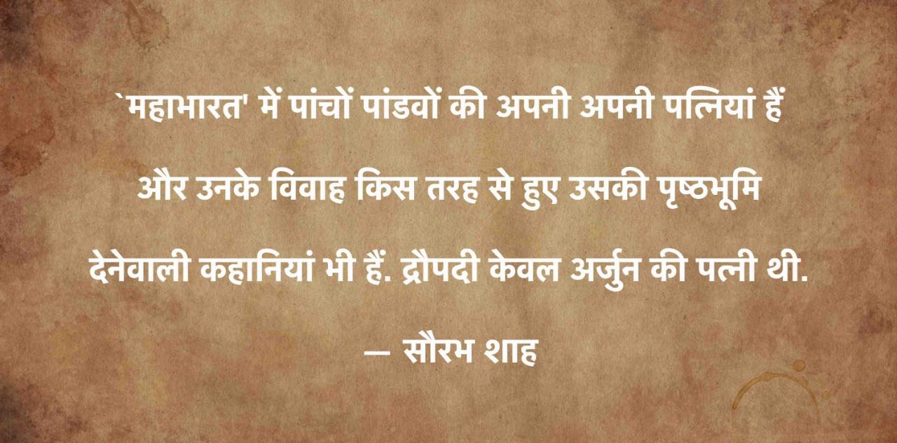 जिस जमाने में प्रिंटिंग की सुविधा नहीं थी उस जमाने में मूल पवित्र ग्रंथों में घालमेल करने काम उस समय के वामपंथियों द्वारा किया गया. जैसे कि मूल `महाभारत’ में `नरो वा कुंजरो वा’ वाला श्लोक है ही नहीं. मूल `महाभारत’ में कुंती माता कहीं ऐसा नहीं कहती हैं कि:`पुत्रों, तुम जो लाए हो उसे पांचों बांट लो.’ हम लोग ये पढ-सुनकर बडे हुए हैं कि अर्जुन अपने चार भाइयों के साथ दौपदी स्वयंवर में तराजू पर घडे होकर मछली का प्रतिबिंब देखकर मत्स्यवेध करके जब आया तब उसने कुटिया के बाहर से मां को पुकार कर कहा कि मां, देखो मैं क्या लाया हूं. और मां कहती है कि: पांचों भाई बांट लो. और तब द्रौपदी पांचों भाइयों की पत्नी बन गई.