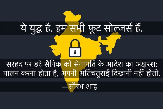 ये युद्ध है. हम सभी फूट सोल्जर्स हैं. हर भारतीय नागरिक को सैनिक जैसा सख्त अनुशासन पालने का ये समय है- चाहे उद्योगपति हों, चाहे सीईओ, चाहे दुकानदार, चपरासी हो, किसान हों, मजदूर हों, चाहे डॉक्टर-इंजीनियर-चार्टर्ड अकाउंटेंट हों, चाहे अभिनेता-लेखक-शिक्षक हों. अभी तो हर कोई एकसमान है. सरहद पर डटे सैनिक को सेनापति के आदेश का अक्षरश: पालन करना होता है, अपनी अतिचतुराई दिखानी नहीं होती. सेनापति ने जो रणनीति बनाई है उसका पालन करने के बजाय सेना यदि आपस में टोलियां बनाकर अपनी तरह से दुश्मनों का सामना करने की सोचेगी तो अराजकता फैला जाएगी. इस अराजकता के परिणामस्वरूप सेनापति चाहे कितना ही सशक्त हो लेकिन हथियार रख देने पडेंगे.
